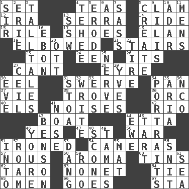 ACROSS 1. Put into a specified state 4. Afternoon social gatherings 8. Dollar (slang) 12. Lyricist Gershwin 13. Spanish missionary in California 14. Travel on an animal 15. Cause heat under the collar 17. Imelda's hoard 18. Style 19. Turned at an angle; bent 21. Flight of steps 23. Small child 24. Car or cant ending 26. ___ a Wonderful Life 27. Patter 28. Jane of fiction 30. Snakelike fish 31. Turn aside suddenly 34. Baking dish 37. Compete 38. Collection of objects 39. The grampus (Milton) 40. Raised railways 41. Annoying sounds 42. River (Sp.) 43. Water vessel 44. Singer James 46. It is so 47. Eastern Standard Time (abbr.) 50. Armed conflict 51. Pressed 54. Devices for capturing images 57. Horse sense 58. Scent 60. Canisters 62. Edible starchy tuberous root 63. Music written for nine 64. Standoff 65. Presage 66. Travels 67. R.R. building DOWN 1. Title for a knight 2. 4th largest of the Great Lakes 3. Baron Munchausen's specialties 4. Giggle 5. Eat (away) 6. "We ___ not amused" (Victoria) 7. Backtalk 8. Make 9. Ms. Damita and namesakes 10. The sixth month of the Jewish calendar 11. Not women's 13. Compass dir. 16. Inky black, to poets 20. Baseball player Mel 22. Become fatigued 25. Effrontery 27. To provide with a ceiling 29. Jacques Cousteau's middle name 30. First lady 31. Portico 32. Compose 33. Greek goddess of the dawn 34. Likenesses of persons 35. Operatic vocal solo 36. Non-commissioned officer (abbr.) 41. Sense of smell 43. Gillaume's butler role 44. She-sheep 45. Small pie 46. You are 48. Biscuitlike quick bread 49. Corrects by punishment or discipline 51. To the inside or interior of 52. Wander 53. Mild oath, euphamism for damn 55. Floor protector 56. In a ____ (agitated or irritated) 59. Friend of Pooh 61. Ocean