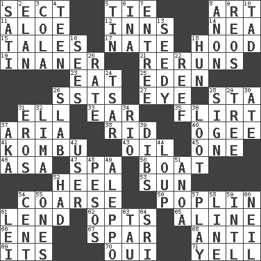 ACROSS 1. Religious group 5. Standoff 8. Tate display 11. _ vera 12. Restaurants 14. Teachers' org. 15. Falsehoods 17. Nathan's nickname 18. Parka part 19. More lacking in sense or substance 21. Summer TV shows 23. Consume 25. Paradise 26. Fast planes 27. Sight organ 28. R.R. building 31. Pipe bend 33. Ewer handle 35. Talk or behave amorously 37. Roberta Peters solo 38. To free from 40. Double curve, resembling the letter S 41. Dried seaweed eaten as food 43. Petroleum 45. Single 46. White ___ sheet 47. Health resort 50. Water vessel 52. The bottom of a shoe or boot 53. Player for Phoenix 54. Unrefined 56. Cotton for raincoats, e.g. 61. Grant temporary use of 62. Chooses 65. Place in a line 66. Compass dir. 67. Coast Guard woman 68. Against 69. ___ a Wonderful Life 70. Fr. "Yes" 71. Shout DOWN 1. Suttee (variant) 2. Liveliness 3. Root beer relative 4. Adolescent 5. Shallow baking pan 6. _ tizzy (2 wds.) 7. Main course 8. Soon (poet.) 9. Vintage cars 10. Small amount or degree 13. Full of seeds 16. Perceives with the eye 18. Attila the _ 20. Assign a rank or rating to 22. Coral collection 24. Russian ruler of old 26. Broad, flat, thick piece 28. Attach a signature 29. Woody plant 30. Had dinner 31. Greek god of love 32. Pale green bean 34. _ de Janeiro 36. Plunder 37. Alias (abbr.) 39. Rights 42. One who makes use of a thing 44. Central Nebraska county 48. Mexican monetary units 49. City in Syria 51. Small Philippine buffalo 52. Possessed 54. Penny 55. Washington bills 57. Shaw product 58. Actor's bit 59. International (abbr.) 60. Famous astronaut Armstrong 61. Flowery wreath 63. The 19th letter of the Greek alphabet 64. Indian title of respect (Mr.)