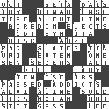 ACROSS 1. Sep. follower 4. Stalk of a moss capsule 8. Raised platform 12. Attempt to accomplish something 13. Middle Eastern gold or silver currency 14. Celtic language 15. Hoop that covers a wheel 17. Native American of Southwest Alaska 18. Actor's bit 19. Mood resulting from idleness 21. Opts 23. Small bed 24. Symbol (abbr.) 26. Call ___ day 27. Plate 28. Axlike tool, used for shaping wood 30. Groovy apt. 31. Chalkboards 34. Metal container 37. RI univ. 38. Eroded 39. Single 40. Elected rep. 41. Spring feasts 42. The first octave above the treble staff 43. Deli pickle 44. Kenny Rogers chart-topper in '80 46. Nine, plus one 47. Compass dir. 50. Big collection agency 51. Went by 54. Inveterate users 57. Mountain range southwest of Kyrgyzstan 58. Place in a line 60. Disposed of to a purchaser 62. Flaplike coverings 63. Pitcher Ryan 64. Fr. "Yes" 65. Proofreading order 66. Global Positioning Systems (abbr.) 67. Area sheltered from the wind DOWN 1. Baseball player Mel 2. Baby bed with high sides 3. Polypeptide antibiotic 4. Grain storage towers 5. Foe 6. The 19th letter of the Greek alphabet 7. Johnson of "Laugh-In" 8. Keyboard key 9. N. Chile seaport 10. Is not 11. Observes 13. Male parent 16. Greek god of love 20. And so on (abbr.) 22. Belonging to Elizabeth 25. Mother 27. Have the gumption 29. Hiding places for outlaws 30. Product of festering 31. Sew up the eyelids of hawks and falcons 32. Dipping utensil 33. Had dinner 34. Inedible or poisonous agaric 35. Inwardly 36. Fish or hair follower 41. Trig term 43. Stop 44. Cards in a Roman deck? 45. Curves 46. Sadhe (variant) 48. Travels by water 49. Ferber et al. 51. Friends 52. Came down and settled, as after flight 53. Mild oath, euphamism for damn 55. Lair 56. Turn sharply 59. Chop off 61. Expire
