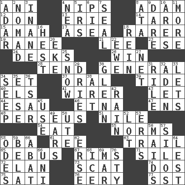 ACROSS 1. Cuckoo 4. Pinches, bites 8. First man 12. Spanish title 13. One of the Great Lakes 14. Pacific island yam 15. Nursemaid 17. At sea 18. Less widely known 19. Indian princess (variant) 21. Area sheltered from the wind 23. Compass dir. 24. Writing tables 26. Acquire through effort 28. Look after 30. Commissioned military rank 34. Put into a specified state 37. Of the mouth 39. Event that recurs at intervals 40. Raised railways 41. One who wires 43. Allow 44. Son of Isaac 46. Inactive volcano in Sicily 47. Followers of ems 48. Son of Zeus who helped slay Medusa 51. The longest river in the world 54. Erode 55. Typical standards 58. Chief or king in Benin or Nigeria 61. To separate or throw off 63. Get behind 65. Alight from a bus 67. Basketball hoops 71. Drop; flow; fall 72. Liveliness 73. Scram! 74. Two (Sp.) 75. Suttee (variant) 76. Suggestive of the supernatural 77. Fast jet (abbr.) DOWN 1. The sixth month of the Jewish calendar 2. Wanderer 3. Empty; void 4. Teachers' org. 5. Big collection agency 6. Sliced dessert 7. Lick closed 8. "One Day ___ Time" 9. Have the gumption 10. Ancient Greek god of war 11. Greater amount 16. Command 18. It's straight from the horse's mouth 20. Make supply last 22. She-sheep 25. Frozen precipitation 27. Remaining after all deductions 29. Frees from moisture 30. American astronaut and politician John 31. Cause heat under the collar 32. Arabian gulf 33. Allows 34. Ooze 35. Otherwise 36. Russian ruler of old 38. Tate display 42. Precipitation 45. Purpose 49. Hearing organs 50. Shoshoni 52. Car dealer's back yard 53. Blunders 56. Unmarried girls 57. Grain storage towers 58. Lyric poems 59. Actor Lugosi 60. Blind as ____ 62. Celtic language 64. For fear that 66. University (slang) 68. Frozen water 69. Third mo. 70. Filthy place