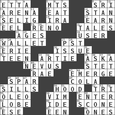 ACROSS 1. Singer James 5. Mountains (abbr.) 8. _ Lanka 11. Sports stadium 13. Consume 14. Comedian Laurel of Laurel & Hardy 15. Former Milwaukee Brewers owner Bud 16. Lyricist Gershwin 17. Merit 18. Snakelike fish 19. Former U.S. Attorney General Janet 21. Lies 22. Ripens 24. One who uses or employs something 25. Place for singles 27. Pacific Standard Time (abbr.) 29. One of the Great Lakes 30. Come out of 32. Adolescent 33. Nick name for Arthur 35. "____ silly question..." 39. Mole, birthmark 41. Proofreading order 42. Actress Charlotte 43. Develop 45. Coast Guard woman 48. Root beer relative 49. Beverly of Met fame 50. Parka part 52. Three (prefix) 55. Margarine 56. Zeal 57. Keyboard key 59. Ear part 60. Binary compound 61. Biscuitlike quick bread 62. Compass dir. 63. Car or cant ending 64. Washington bills DOWN 1. Comfort 2. Woody plant 3. Copy Pinocchio 4. Black tropical American cuckoo 5. Chow _ 6. Edible starchy tuberous root 7. R.R. building 8. Having lost freshness 9. Less widely known 10. Lodging establishments 12. Match 14. Oceans 20. Eastern Standard Time (abbr.) 21. Ballerina skirt 23. American astronaut and politician John 25. Dripping 26. "We ___ not amused" (Victoria) 27. Air pressure measure (abbr.) 28. Compass dir. 30. ___ a Wonderful Life 31. Artist's stand 33. Actress Gardner 34. Sorrow 36. Ski resort town in Vermont 37. Barrel 38. Had dinner 40. Blunders 43. Environmental prefix 44. Methods 45. Grain storage towers 46. First-year military academy student 47. _ vera 49. Flatfish 50. Flintstone garb 51. Sign of something about to happen 53. French philosopher Descartes 54. Angers 56. Compete 58. Non-commissioned officer (abbr.)