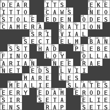 ACROSS 1. Letter starter 5. It is 8. Supplement with great effort 11. "Tell ____ the Marines!" 12. Crow sounds 14. Modern: prefix 15. Fur scarf 17. Locale of original sin 18. Lyric poems 19. Device for capturing images 21. Food allowance for one day 23. _ Lanka 25. Small bottle 26. Religious group 27. Shade tree 28. Forbid 31. Fast jet (abbr.) 33. Possessed 35. Military trainee 37. A pale, very dry sherry 38. Myrna of the movies 40. Rounded earthenware pot or jar 41. Believer in; advocate of (suffix) 43. Born 45. Actress Charlotte 46. Fish or hair follower 47. Begley and Asner 50. 57 in ancient Rome 52. Female horse 53. French article 54. Ear of corn 56. Chalkboards 61. Suggestive of the supernatural 62. Dutch treat 65. Wear away 66. Title for a knight 67. Stalk of a moss capsule 68. Writer Wiesel 69. Followers of ems 70. Hit sharply and swiftly 71. Arranges properly for use DOWN 1. Plate 2. Singer James 3. Smallest unit of an element 4. Hero or heavy, e.g. 5. Frozen water 6. Small boy 7. Turn aside suddenly 8. Inside; within (prefix) 9. Peachy ____! 10. Greek goddess of the dawn 13. Slow-paced one 16. Celtic language 18. Petroleum 20. Bowlike part 22. Pack (down) 24. Slanted text style (abbr.) 26. Portico 28. Actor Lugosi 29. Competent 30. Teachers' org. 31. Father 32. In a ____ (agitated or irritated) 34. Spanish title 36. Australian parrot (variant) 37. Air blower 39. Shout 42. Actress Patricia 44. Nights before holidays 48. Frees from moisture 49. Sowing specialist 51. Capri or Wight 52. Can I? 54. Chow _ 55. Blunders 57. Ancient Greek god of war 58. Lacquered or enameled metalware 59. Prepare for publication 60. Observes 61. Compass dir. 63. _ moment's notice (2 wds.) 64. Atlas unit