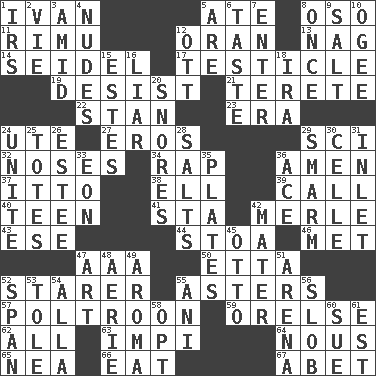 ACROSS 1. _ the terrible 5. Had dinner 8. Bear (Spanish) 11. Tall New Zealand timber tree 12. Northwest Algerian city 13. Tired old horse 14. Beer mug 17. One of the two male reproductive glands 19. Cease 21. Cylindrical with tapered ends 22. Comedian Laurel of Laurel & Hardy 23. Period 24. Shoshoni 27. Greek god of love 29. _-fi 32. Olfactory organs 34. Hit sharply and swiftly 36. So be it 37. "Tell ____ the Marines!" 38. Pipe bend 39. Give a ring to 40. Adolescent 41. R.R. building 42. Haggard of country music 43. Compass dir. 44. Portico 46. Was introduced to 47. Auto club (abbr.) 50. Singer James 52. A viewer who gazes fixedly 55. Michaelmas daisies 57. Characterized by complete cowardliness 59. Threatening words 62. 100% 63. Body of Kaffir warriors 64. Common sense 65. Teachers' org. 66. Consume 67. Collude with DOWN 1. Big collection agency 2. Compete 3. Among 4. Unadorned figures 5. "We ___ not amused" (Victoria) 6. Clothes sense 7. Keyboard key 8. Single time 9. Table seasoning 10. Double curve, resembling the letter S 12. Baseball player Mel 15. _____ Park, CO 16. One who doesn't tell the truth 18. Retirement account (abbr.) 20. Sounds asleep 24. Join together 25. Lugs 26. First name in cosmetics 28. Table seasonings 29. Excessive but superficial compliments 30. Cell (Danish) 31. An arm off of a larger body of water 33. Period of immesurable duration 35. Food holders 36. Adept person 42. Mother 45. Von Bismarck 47. Tate display 48. Nest on high 49. Scent 51. Sports stadium 52. Connect, as a bridge 53. Lacquered or enameled metalware 54. Silent film actress Nazimova 55. Black tropical American cuckoo 56. Messy guy 58. Elect 60. Institute legal proceedings 61. Eastern Standard Time (abbr.)