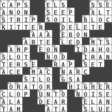 ACROSS 1. Smile enhancers 5. Raised railways 8. Compass dir. 11. At once, immediately (arch.) 12. Ooze 14. Keyboard modifier key 15. Long narrow piece of something 17. The visible part of the earth's surface 18. Coalition 19. Baby cat 21. Keyboard key 23. Auto club (abbr.) 25. Inky black, to poets 26. Johnson of "Laugh-In" 27. Directed 28. Mountains (abbr.) 31. Electrical Unit 33. A really long time 35. Potato state 37. Narrow, elongated depression 38. Dreamland 40. SW Asia republic 41. Laconic 43. Hit sharply and swiftly 45. Put into a specified state 46. Adept person 47. Apple computer (short form) 50. Drug cop 52. Grain storage tower 53. Girls' org. (abbr.) 54. Speaker 56. Having greater elevation 61. Hoof sound 62. To (old English) 65. Annoying sound 66. Wing 67. Letter starter 68. Flair 69. Scottish cap 70. _ moment's notice (2 wds.) 71. Turn sharply DOWN 1. Keg 2. Opposed to 3. Left side of a ship or aircraft 4. In a ____ (agitated or irritated) 5. Double-curved letter 6. Lion 7. Beer mug 8. Table seasoning 9. A type of plum 10. And so on (abbr.) 13. First-year military academy student 16. Lightbulb-shaped fruit 18. Benjamin's nick name 20. Nathan's nickname 22. Farming town in central California 24. Period of immesurable duration 26. Tenement units (abbr.) 28. Female horse 29. Not this but _ 30. Boy, to dad 31. Actor Baldwin 32. Greater amount 34. And not 36. Flat circle 37. R.R. building 39. Mild oath, euphamism for damn 42. Send forth 44. Romantic infatuation 48. Verbally 49. Pupil covering 51. Water falling in drops from the sky 52. Plant excrement 54. Water jar 55. Wander aimlessly 57. Travels 58. Land elevation 59. He sold his birthright 60. French philosopher Descartes 61. Feline 63. Make lace 64. Mouth or opening