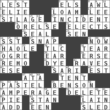 ACROSS 1. For fear that 5. Raised railways 8. Leather borer 11. Writer Wiesel 12. Rich soil 13. Area sheltered from the wind 14. Fodder prepared in a silo 17. Event 19. Threatening words 21. Opts 22. Lick closed 23. Elected rep. 24. Fast jet (abbr.) 27. Fastener 29. At this time 32. White Person, in Hawaii 34. Affectionate concern, for short 36. Lacerate 37. Legendary monster 38. Hearing organ 39. Celtic language 40. San ____ (Riviera town) 41. Color 42. All-night dance parties 43. Compass dir. 44. Indian skirt 46. Eastern Standard Time (abbr.) 47. "One Day ___ Time" 50. Portable shelter 52. Soft color 55. Gillaume's butler role 57. Electrical Measurement 59. Keyboard key 62. Sliced dessert 63. Comedian Laurel of Laurel & Hardy 64. (Had) reclined 65. Increase 66. Car or cant ending 67. Downhill vehicle DOWN 1. French article 2. Connecticut Ivy Leaguer 3. Grain storage tower 4. Pulls into pieces 5. Period of immesurable duration 6. Shoestrings 7. Grin 8. Actor Baldwin 9. Gone 10. Allows 12. Untruth 15. Honkers 16. Liveliness 18. Lair 20. Scheduled 24. Dinah or Pauly 25. Gurus 26. Singer Mel 28. Live dramatic performances 29. Impudent aggressiveness 30. Fertile tracts in a desert 31. Take or capture by force 33. Lion 35. Make 36. Afternoon social gathering 42. Remove soap 45. Tear apart 47. Had dinner 48. Laconic 49. Having winglike extensions 51. For Whom the Bell _____ 52. Dad 53. Among 54. Moved rapidly 55. Benjamin's nick name 56. Anneal 58. Separate the seeds from cotton 60. Make a knot 61. Conclude
