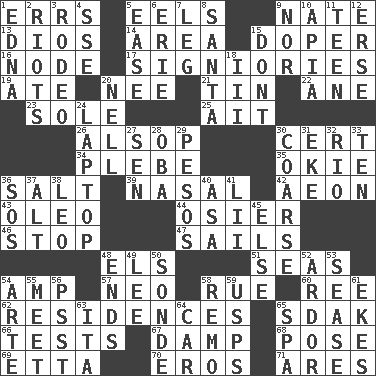 ACROSS 1. Blunders 5. Snakelike fish 9. Nathan's nickname 13. "Vaya con ____" 14. Length times width 15. Drug addict 16. Connecting point 17. Seigniories (variant) 19. Had dinner 20. Born 21. Shallow baking pan 22. One (Scot) 23. Flatfish 25. Small island 26. Columnist Joseph or Stewart 30. Certainty 34. Cadet 35. Migrant worker of the '30s 36. Table seasoning 39. Relating to the nose 42. A really long time 43. Butter sub 44. Flexible twig of a willow tree 46. Obstruct or block passage 47. Moves on water 48. Raised railways 51. Oceans 54. Electrical Unit 57. Modern: prefix 58. Sorrow 60. To riddle 62. Homes 65. Neighbor of Neb. 66. Trials 67. Moist 68. Airs 69. Singer James 70. Greek god of love 71. Ancient Greek god of war DOWN 1. Pulitzer Prize-winning author Ferber 2. Disturbances 3. Cowboy competition 4. Compass dir. 5. Relaxation 6. 4th largest of the Great Lakes 7. Part of a journey 8. Before Barbara or Clara 9. Not either 10. Capital of Western Samoa 11. Adolescent 12. Celtic language 15. Do not 18. One more than two 20. 1994 drama film starring Jodie Foster 24. Portable computer 27. Elected rep. 28. Chief or king in Benin or Nigeria 29. Mexican monetary units 30. Unrefined 31. Make supply last 32. _ de Janeiro 33. Nine, plus one 36. Distress signal 37. Keyboard modifier key 38. Lion 40. White ___ sheet 41. Cards in a Roman deck? 45. Otherwise 48. Extremities 49. Area sheltered from the wind 50. Message 52. Zeal 53. Gospel singer Marvin 54. Johnson of "Laugh-In" 55. Confront 56. Inconspicuous attention getter 58. San ____ (Riviera town) 59. United States Postal Service (abbr.) 61. Supplements with great effort 63. Call ___ day 64. Automobile 65. Health resort