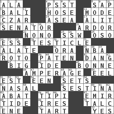 ACROSS 1. In the manner of 4. Inconspicuous attention getter 8. Plant excrement 11. Indonesian resort city 13. Stockings 14. Method 15. Russian ruler of old 16. Toward the sea 17. Came down and settled, as after flight 18. Elected representative 21. Zeal 22. Words to Nanette 23. Compass dir. 25. Bear (Spanish) 26. Curvy letter 29. A testis 32. Having winglike extensions 34. Mouth or opening 35. Basketball assoc. 38. Printing process, for short 39. Eucharist need 41. Mild oath, euphamism for damn 43. Large 44. Binary compound 45. Child's nurse 46. Electrical Measurement 50. Snakelike fish 51. Eastern Standard Time (abbr.) 54. Car or cant ending 55. Puts into a specified state 57. Rhinal 59. French poetic form 63. Blind as ____ 64. Native american tent (variation) 67. Arab leader 68. Periodic rise and fall of the sea level 69. Angers 70. Baby powder 71. Compass dir. 72. Small pie 73. Consenting reply DOWN 1. Lettered men learn these first 2. Goldbrick 3. Actor Alda or Thicke 4. N Egypt peninsula 5. Distress signal 6. Compass dir. 7. Beverage made from leaves 8. Twentieth part of a lira 9. Goodbye (Sp.) 10. Stone: prefix 12. SW Asia republic 14. Impair 19. Lug 20. Single 21. Leather borer 23. Title for a man of rank and authority 24. Skim 26. Hearing organ 27. Messy guy 28. Suttee (variant) 30. Carrier 31. Inside; within (prefix) 33. Ancient Roman robe 36. Object of repulsion 37. Singer Murray 39. Corncob 40. An important port of Yemen 42. Set 45. Stakes 47. Cartoonist voice _ Blanc 48. Aid 49. Turn to the right 51. Maternal 52. Unit of acoustic absorption 53. Sadhe (variant) 56. Proofreading order 58. Had dinner 60. "If ____ say so..." 61. Mediterranean tributary 62. Curves 64. Teat (slang) 65. Lyricist Gershwin 66. For each