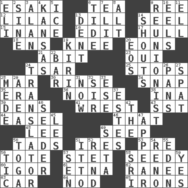 ACROSS 1. 1973 Nobel Price Winner (Physics) Leo 6. Beverage made from leaves 9. To separate or throw off 12. Pale purple color 13. Deli pickle 14. Sew up the eyelids of hawks and falcons 15. Empty; void 16. Prepare for publication 17. Frame or body of a ship 18. Followers of ems 19. Leg joint 20. Immeasurably long periods of time 21. "This won't hurt ____!" 23. Fr. "Yes" 24. Russian ruler of old 25. Ceases 28. Make imperfect 30. Remove soap 34. Fastener 35. Epoch 36. Annoying sound 38. _ tizzy (2 wds.) 39. Lairs 41. Obtain by seizing forcibly or violently 43. Fast jet (abbr.) 44. Artist's stand 46. Not this but _ 48. Area sheltered from the wind 49. Ooze 50. Small boys 51. Angers 53. Before (prefix) 56. Carry 57. Proofreading order 58. Sleazy 60. Composer Stravinsky 61. Inactive volcano in Sicily 62. Indian princess (variant) 63. 4-wheeled motor vehicle 64. Lower and raise head in agreement 65. Removes the wrinkles DOWN 1. Connecticut Ivy Leaguer 2. Trig term 3. Actor Alda or Thicke 4. Sunflower state 5. Frozen water 6. Event that recurs at intervals 7. Writer Wiesel 8. The first octave above the treble staff 9. One who advocates reunion 10. Snakelike fish 11. Pipe bend 13. Gouge 14. Yells 19. Japanese brewing company 20. Greek goddess of the dawn 22. Soap unit 24. Interpreter 26. Zero-star reviews 27. Petty quarrel 28. Ancient Persian 29. Type of rug 31. At this time 32. Title for a knight 33. Compass dir. 37. _____ Park, CO 40. Sowing specialist 42. Definite Article 45. French article 47. Become visible 49. Stalk of a moss capsule 50. Ancient Roman robe 51. "Tell ____ the Marines!" 52. Tear apart 54. Western Nevada city 55. Locale of original sin 56. Nervous spasm 57. Elected rep. 58. Indian title of respect (Mr.) 59. It is so