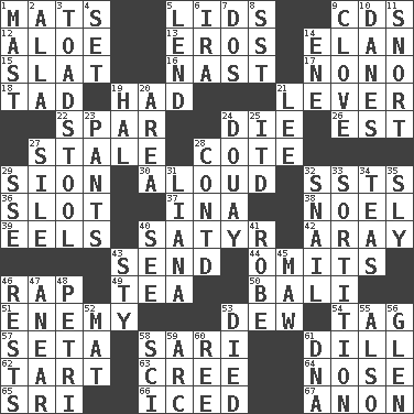 ACROSS 1. Floor protectors 5. Hats (slang) 9. Music discs 12. Medicinal plant 13. Greek god of love 14. Style 15. Narrow board 16. Political cartoonist Thomas 17. Words to Nanette 18. Small boy 19. Possessed 21. Prying instrument 22. Coast Guard woman 24. Pass on 26. Eastern Standard Time (abbr.) 27. Lacking originality or spontaneity 28. ____ d'Azur (French Riviera) 29. The Jewish people; Israel 30. Verbally 32. Fast planes 36. Position in a hierarchy or organization 37. _ tizzy (2 wds.) 38. Christmas carol 39. Snakelike fish 40. Letch 42. Like ___ of sunshine 43. Transmit 44. Leaves out 46. Strike 49. Afternoon social gathering 50. Indonesian resort city 51. Foe 53. Morning condensation 54. Label 57. Bristle 58. Indian skirt 61. Deli pickle 62. Small pie 63. Algonquian 64. Sense of smell 65. Indian title of respect (Mr.) 66. On the rocks 67. Soon (poet.) DOWN 1. Vertical spar for supporting sails 2. Silent film actress Nazimova 3. Inedible or poisonous agaric 4. Put into a specified state 5. Grant temporary use of 6. Lyricist Gershwin 7. Two (Sp.) 8. Fast jet (abbr.) 9. Garlic unit 10. Natives or inhabitants of Denmark 11. Derisive sound 14. Compass dir. 19. Actor Linden 20. Type of rug 21. Area sheltered from the wind 23. Leg coverings 24. A city in N France, SE of Calais 25. It would 27. Filth; sediment 28. Continued (abbr.) 29. Compass dir. 31. Climbing, woody, usually tropical vines 32. Slow-paced one 33. Casting lots 34. Beverages made from leaves 35. Roguish 40. Observe 41. Loose flowing garment 43. Filthy place 45. Informal term for the mouth 46. Musical pauses 47. Approach 48. _ dish (used to culture cells) 52. Floor protector 53. Passed on 55. In addition 56. Small, secluded valley 58. _-fi 59. Curve 60. To riddle 61. Heredity factor (abbr.)