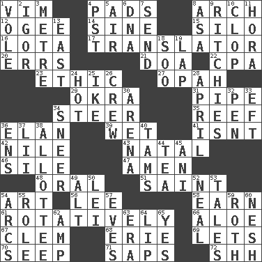 ACROSS 1. Zeal 4. Writing tablets 8. Bowlike part 12. Double curve, resembling the letter S 14. Trig term 15. Grain storage tower 16. Globular water bottle used in Asia 17. Interpreter 20. Blunders 21. ___ good deed 22. Numbers guy (abbr.) 23. Moral principle 27. Brightly colored fish 29. Gumbo ingredient 31. Corncob 34. Bull 35. Coral collection 36. Style 39. Soggy 41. Is not 42. Mediterranean tributary 43. Brizilian seaport 46. Drop; flow; fall 47. So be it 48. Taken by mouth 51. Inhabitant of Heaven 54. Tate display 56. Area sheltered from the wind 58. Merit 61. Happening in regular succession 66. _ vera 67. Clement's nick name 68. One of the Great Lakes 69. Allows 70. Ooze 71. Plant excrements 72. Quiet! DOWN 1. Short-tailed, large-bodied rat 2. Composer Stravinsky 3. Distance measurement (Brit.) 4. Pacific Standard Time (abbr.) 5. Atmosphere 6. Heredity factor (abbr.) 7. Transmit 8. White ___ sheet 9. Actors Guy, Robert Welles, and Clint 10. Hoof sound 11. Israeli folk dance 13. 90 degrees 18. "Barney Miller" actor Jack 19. Infant locale 24. Being at a high temperature 25. D.D.E's nickname 26. Group working together 28. Showery time 30. Sports stadium 32. Fenced enclosure 33. Lizard (obsolete) 34. Scornful expression 36. Followers of ems 37. Cards in a Roman deck? 38. One to whom something is allotted 40. Scottish caps 44. Beverage made from leaves 45. Cuckoo 49. The first octave above the treble staff 50. Flowery wreath 52. Anneal 53. Stories 54. Curves 55. Hero or heavy, e.g. 57. Nights before holidays 59. Writer of Portnoy's Complaint (1969) 60. Tender 62. Electrical Unit 63. Epoch 64. Mouth edge 65. Affirmative reply