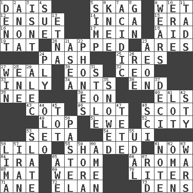 ACROSS 1. Raised platform 5. Heroin 9. Dripping 12. Take place subsequently 14. South American Indian 15. Epoch 16. Music written for nine 17. Count _ (2 wds.) 18. Help 19. Make lace 20. Slept 23. Ancient Greek god of war 24. Romantic infatuation 25. Angers 27. Welt 30. Greek goddess of the dawn 32. Corporate head (abbr.) 33. In an inward manner 34. Pismires 36. Conclusion 38. Born 39. A really long time 40. Raised railways 43. Small bed 46. Position in a hierarchy or organization 48. Native of Scotland 49. Trim (branches) 51. She-sheep 52. Municipality 53. Bristle 54. Needle holder 56. _ and Stitch 58. Cast a shadow over 61. At this time 64. Lyricist Gershwin 65. Smallest unit of an element 66. Odor 68. Floor covering 69. Past tense of be (plural) 70. 61 cubic inches 71. One (Scot) 72. Style 73. Lairs DOWN 1. Gouge 2. Small Philippine buffalo 3. Is not 4. Take to court 5. Simple or foolish person 6. Leg joint 7. Being or containing an acid 8. Separate the seeds from cotton 9. Puts on (as clothing) 10. 4th largest of the Great Lakes 11. Bits 13. Inactive volcano in Sicily 21. Toward the sea 22. Gives a jingle 23. Period of immesurable duration 24. Travel a route regularly 26. To separate or throw off 27. Acquire through effort 28. Compass dir. 29. Actor Baldwin 31. Fur scarf 35. Overwhelmed 37. Tenth: prefix 41. Car dealer's back yard 42. Filthy place 44. Margarine 45. Small child 47. Wig 48. _-fi 50. Soft color 53. Chalkboard 55. Freehold land 56. Pale green bean 57. SW Asia republic 59. Israeli folk dance 60. So be it 61. Brief written record 62. Presage 63. Armed conflicts 65. Deep reverence 67. To free from