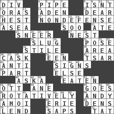 ACROSS 1. HTML Container Element 4. Corncob 8. Is not 12. Mouths or openings 14. Arabian gulf 15. Letter starter 16. Command 17. Unrelated to defense, as in spending 20. Toward the sea 21. "Barney Miller" actor Jack 22. Had dinner 23. Contemptuous expression 27. A home for chicks 29. A hard, heavy blow 31. Introduce or present, as a question 34. Vertical member of a panel or frame 35. Type of rug 36. Keg 39. Car or cant ending 41. Russian ruler of old 42. Against 43. Attaches a signature 46. Component 47. Otherwise 48. "____ silly question..." 51. Ingested 54. Baseball player Mel 56. One (Scot) 58. Travels 61. Happening in regular succession 66. Actor Griffith 67. Mine, in Marseilles 68. One of the Great Lakes 69. Habitations of wild animals 70. Grant temporary use of 71. Plant excrements 72. Make lace DOWN 1. Capital of the state of Qatar 2. Angers 3. Flower holders 4. Baking dish 5. Wedding promise 6. Fenced enclosure 7. Extremities 8. Binary compound 9. Legislators 10. Political cartoonist Thomas 11. Woody plant 13. Comedian Laurel of Laurel & Hardy 18. Period of immesurable duration 19. Enemy 24. Eastern Standard Time (abbr.) 25. Connecticut Ivy Leaguer 26. Court order 28. Arguments over trivial matters 30. Honkers 32. Ocean 33. Hearing organ 34. Burlesque acts 36. Head covering 37. Santa ___, CA 38. Ski resort town in Vermont 40. "Death on the ____" 44. Girls' org. (abbr.) 45. Fish or hair follower 49. Krazy ___ of comics 50. Black tropical American cuckoo 52. Mild oath 53. Music written for nine 54. Taken by mouth 55. Heavy book 57. Nights before holidays 59. Pulitzer Prize-winning author Ferber 60. System (abbr.) 62. Help 63. Period 64. Mouth edge 65. Consenting reply