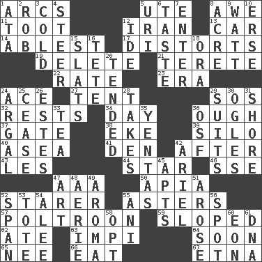 ACROSS 1. Curves 5. Shoshoni 8. Deep reverence 11. A blast of a horn 12. SW Asia republic 13. 4-wheeled motor vehicle 14. Most capable 17. What propaganda does 19. Keyboard key 21. Cigar-shaped 22. Assign a rank or rating to 23. Epoch 24. Adept person 27. Portable shelter 29. Mayday 32. Musical pauses 34. 24 hours 36. Ending for "Through" and "Enough" 37. Yard entry 38. Supplement with great effort 39. Grain storage tower 40. At sea 41. Lair 42. Following 43. French article 44. Play the lead 46. Compass dir. 47. Auto club (abbr.) 50. Capital of Western Samoa 52. A viewer who gazes fixedly 55. Michaelmas daisies 57. Characterized by complete cowardliness 59. Had an oblique or slanted direction 62. Had dinner 63. Body of Kaffir warriors 64. Within a short period 65. Born 66. Erode 67. Inactive volcano in Sicily DOWN 1. "One Day ___ Time" 2. Director Reiner 3. Having a low temperature 4. Navigate 5. RI univ. 6. Clothes sense 7. Keyboard key 8. Measure of real estate 9. Electrical Unit 10. Celtic language 12. Binary compound 15. Narrow boards 16. False hair 18. Mouth or opening 20. Watched over 24. Therefore, facetiously 25. Desist 26. _____ Park, CO 28. Receives possession of 29. Costumes for special activities 30. Stares 31. Dinah or Pauly 33. Afternoon social gathering 35. Gossips 36. Order of Saint Francis (abbr.) 42. Satellite of Uranus 45. Tenement units (abbr.) 47. Nonscientific branch of learning 48. Nest on high 49. Odor 51. Came up 52. Connect, as a bridge 53. Carry 54. Toward shelter 55. Black tropical American cuckoo 56. Blemish 58. Choose 60. Period of immesurable duration 61. Heredity factor (abbr.)