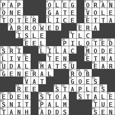 ACROSS 1. Infant food 4. Cassini of fashion 8. Northwest Algerian city 12. Single 13. Yard entry 14. Grand slam 15. Carrier 18. Louse (plural) 19. Singer James 20. Moved like an arrow 22. Epoch 23. Capri or Wight 24. Affectionate concern, for short 25. Snakelike fish 26. Manned the helm 30. _ Lanka 33. Pale purple color 36. Method 37. Moving, as bait 39. Nine, plus one 40. Inactive volcano in Sicily 41. Hereditary estate 42. Taiwanese island in East China Sea 44. Ewer handle 45. Commissioned military rank 47. Director Reiner 50. Large container 51. Leaves 53. Portuguese money of account (variant) 54. Paper fasteners 57. Genesis locale 59. Portico 61. Showing deterioration from age 63. In a ____ (agitated or irritated) 64. Inside of hand 65. Third day of the wk. 66. Hyperbolic tangent 67. Sums up 68. Elected rep. DOWN 1. Cooking vessel 2. Small Philippine buffalo 3. _ dish (used to culture cells) 4. Stare 5. Put down 6. And so on (abbr.) 7. Unit of force equal to gravity 8. Conquer 9. Roll call or roster of names 10. Keyboard modifier key 11. Teachers' org. 16. Celtic language 17. Hero or heavy, e.g. 21. Not ill 22. Pipe bend 24. Nervous spasm 26. Baking dishes 27. Carryall 28. Pulitzer Prize-winning author Ferber 29. Letter starter 30. A hard, heavy blow 31. Travel on or in a vehicle 32. _ the terrible 34. Slanted text style (abbr.) 35. Allow 38. Veterans Day date 42. Floor protector 43. Capital and largest city of Mongolia 46. Actress Charlotte 48. I made a mistake 49. Waist strap 52. Theater features 53. It's straight from the horse's mouth 54. Exchanged or delivered for money 55. Scottish caps 56. Change direction abruptly 57. Eastern Standard Time (abbr.) 58. Heredity factor (abbr.) 59. Health resort 60. Small boy 62. Car or cant ending