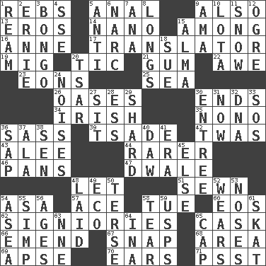 ACROSS 1. Confederate soldiers (slang) 5. Of or related to the anus 9. In addition 13. Greek god of love 14. Billionth: prefix 15. Amid 16. Singer Murray 17. Interpreter 19. Russian fighter aircraft 20. Nervous spasm 21. Chewing product 22. Deep reverence 23. Immeasurably long periods of time 25. Ocean 26. Fertile tracts in a desert 30. Conclusions 34. From or relating to Ireland 35. Words to Nanette 36. Backtalk 39. Sadhe (variant) 42. It was, poetically 43. Toward shelter 44. More valued for its uncommonness 46. Zero-star reviews 47. A sleeping potion; an opiate (poet.) 48. Allow 51. Stitched 54. White ___ sheet 57. Adept person 58. Third day of the wk. 60. Greek goddess of the dawn 62. Seigniories (variant) 65. Keg 66. Make improvements or corrections to 67. Fastener 68. Length times width 69. Domed church section 70. Hearing organs 71. Inconspicuous attention getter DOWN 1. 480, 500 or 516 sheets of paper 2. Bert's buddy 3. Beat drum 4. Compass dir. 5. Opposed to 6. Drug cop 7. Santa ___, CA 8. Yearns 9. Nanny (var.) 10. Globular water bottle used in Asia 11. Frozen precipitation 12. Legendary monster 15. _ mater 18. Take to court 20. Russian ruler of old 24. Annoying sounds 27. Be seated 28. Double-curved letter 29. Pottery fragment 30. Main course 31. At this time 32. Heredity factor (abbr.) 33. Distress signal 36. Plant excrement 37. Chicken ___ king 38. Elected rep. 40. Obsolete 41. Period 45. Otherwise 48. Put down 49. Environmental prefix 50. Laconic 52. Puts on (as clothing) 53. Olfactory organs 54. At sea 55. Simple or foolish person 56. Grows older 58. Pull apart 59. United States Postal Service (abbr.) 61. Three-handed card game 63. Compass dir. 64. _ tizzy (2 wds.) 65. Head covering
