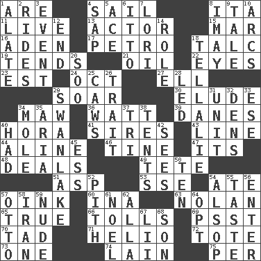 ACROSS 1. "We ___ not amused" (Victoria) 4. Travel by water 8. Call ___ day 11. Moving, as bait 13. Thespian 15. Third mo. 16. Arabian gulf 17. Stone: prefix 18. Baby powder 19. Is inclined (to) 21. Lubricate 22. Sight organs 23. Eastern Standard Time (abbr.) 24. Sep. follower 27. Pipe bend 29. Fly high 30. Dodge 34. Opening into something insatiable 36. Electrical Unit 39. Natives or inhabitants of Denmark 40. Israeli folk dance 41. Fathers 43. Actor's bit 44. Place in a line 46. Prong on a fork 47. It is 48. Allots cards 49. False hair 51. Cleo's killer 53. Compass dir. 54. Had dinner 57. Pig sound 60. _ tizzy (2 wds.) 63. Pitcher Ryan 65. Loyal 66. For Whom the Bell _____ 69. Inconspicuous attention getter 70. Small amount or degree 71. Sun: prefix 72. Haul 73. Single 74. (Had) reclined 75. For each DOWN 1. Having winglike extensions 2. Amusement-park features 3. Incident 4. Plant excrement 5. Adept person 6. "Tell ____ the Marines!" 7. Australian parrot (variant) 8. "If ____ say so..." 9. Falsehood 10. Curves 12. Conclusion 14. Hero or heavy, e.g. 18. Copy Pinocchio 20. "Barney Miller" actor Jack 25. Crow sounds 26. Distinguishing feature 28. Directed 29. Tchaikovsky ballet 31. A single undivided whole 32. Habitations of wild animals 33. Compass dir. 34. Undercover agent 35. Operatic vocal solo 37. Three (prefix) 38. Portable shelters 40. Possessed 42. Perceives with the eye 45. Double-curved letter 50. Nine, plus one 52. Heart or essence 54. Columnist Joseph or Stewart 55. Clothes sense 56. Keyboard key 57. Von Bismarck 58. SW Asia republic 59. Unadorned 61. Christmas carol 62. Silent film actress Nazimova 64. Choose 67. Cards in a Roman deck? 68. Manchild