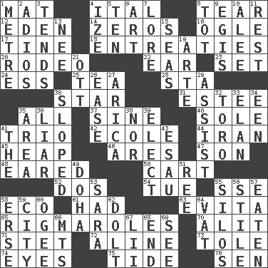 ACROSS 1. Floor protector 4. Slanted text style (abbr.) 8. Separate forcefully 12. Paradise 14. Nothings 16. Stare at amorously 17. Prong on a fork 18. Pleas 20. Cowboy competition 22. Ewer handle 23. Arrange properly for use 24. Double-curved letter 25. Beverage made from leaves 28. R.R. building 30. Play the lead 31. First name in cosmetics 35. 100% 37. Trig term 40. Flatfish 41. Musical group of three 42. Learning spot: Fr. 44. SW Asia republic 45. Pile 46. Ancient Greek god of war 47. Male offspring 48. Having ears or earlike features 50. Draw slowly or heavily 52. Two (Sp.) 54. Third day of the wk. 55. Compass dir. 58. Environmental prefix 61. Possessed 63. Webber/Rice musical 65. Complicated, petty procedures 70. Set down 71. Proofreading order 72. Place in a line 73. Lacquered or enameled metalware 74. Sight organs 75. Periodic rise and fall of the sea level 76. Elected rep. DOWN 1. Distance measurement (Brit.) 2. Goodbye (Sp.) 3. Watches over 4. Ending with capital 5. "___ Little Indians" 6. Tate display 7. Old wives' tales, e.g. 8. Small child 9. Armor plate that protects the chest 10. Toward shelter 11. Repose 13. Born 15. Oceans 19. Johnson of "Laugh-In" 21. Baseball player Mel 26. Comfort 27. N. Chile seaport 29. Aid 30. Inclined 32. "Corrida" creature 33. Flair 34. Car or cant ending 35. Length times width 36. One who doesn't tell the truth 38. Not either 39. Choose 41. Definite Article 43. Son of Isaac 49. Capital of the state of Qatar 51. To separate or throw off 53. "Two Mules for Sister ____" 55. Grain storage towers 56. Vertical member of a panel or frame 57. Consumed 58. Celtic language 59. Municipality 60. Double curve, resembling the letter S 62. Dunce 64. Large container 66. Mountains (abbr.) 67. Cards in a Roman deck? 68. Conclusion 69. Observe