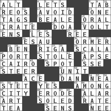 ACROSS 1. Keyboard modifier key 4. Allows 8. Keyboard key 11. Vintage cars 13. Prevent the occurrence of 15. Single 16. Labels 17. Memphis, Tenn. Street 18. Of the mouth 19. Feeling or showing extreme anger 21. ___ good deed 22. Electrical Unit 23. Followers of ems 24. French article 27. To riddle 29. Son of Isaac 30. Channel Islands abalone 34. Benjamin's nick name 36. Port city in Latvia 39. Any of the three canals of the cochlea 40. Left side of a ship or aircraft 41. Took without asking 43. Domed church section 44. Capital of Egypt 46. Blemish 47. Compass dir. 48. Navigate 49. A single undivided whole 51. Adept person 53. One of the 12 tribes of Israel 54. Teachers' org. 57. Proofreading order 60. Consenting reply 63. Amid 65. Municipality 66. Eat (away) 69. Having or resembling wings 70. Tate display 71. Having a sole or soles 72. Pace 73. Beverage made from leaves 74. Elected reps. 75. Born DOWN 1. Nick name for Arthur 2. Memorize 3. Ancient Roman robes 4. Experiment locale 5. First lady 6. Frog relative 7. Grain storage tower 8. "Corrida" creature 9. Of or related to the anus 10. Waist strap 12. Fast jet (abbr.) 14. Letter starter 18. Cloudy 20. Raised railways 25. Hearing organs 26. Costumes for special activities 28. Greek goddess of the dawn 29. Plea 31. Atlas contents 32. Otherwise 33. Actress Charlotte 34. Water vessel 35. 4th largest of the Great Lakes 37. Grand Old Party 38. Verbally 40. Personal Computers (abbr.) 42. Inactive volcano in Sicily 45. The grampus (Milton) 50. _ tizzy (2 wds.) 52. Sight organs 54. Pitcher Ryan 55. Related on the mother's side 56. Match 57. Go away! 58. Hoop that covers a wheel 59. Singer James 61. Greek god of love 62. Flatfish 64. Third mo. 67. Lair 68. Begley and Asner