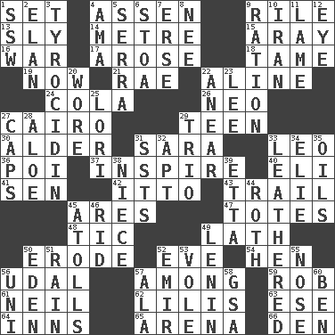 ACROSS 1. Put into a specified state 4. NE Netherlands city 9. Cause heat under the collar 13. Mischievous 14. Distance measurement (Brit.) 15. Like ___ of sunshine 16. Armed conflict 17. Came up 18. Docile 19. Immediately 21. Actress Charlotte 22. Place in a line 24. Root beer relative 26. Modern: prefix 27. Capital of Egypt 29. Adolescent 30. Tree or shrub in the Birch family 31. "Two Mules for Sister ____" 33. Lion 36. Luau course 37. Motivate 40. Biblical high priest 41. Elected rep. 42. "Tell ____ the Marines!" 43. Go after with the intent to catch 45. Ancient Greek god of war 47. Hauls 48. Nervous spasm 49. Thin strip of wood or metal 50. Eat (away) 52. First lady 54. Layer 56. Hereditary estate 57. Amid 59. Director Reiner 61. Famous astronaut Armstrong 62. Ms. Damita and namesakes 63. Compass dir. 64. Lodging establishments 65. Sports stadium 66. Lair DOWN 1. Compass dir. 2. Enthusiasm 3. Polypeptide antibiotic 4. Nanny (var.) 5. Spanish missionary in California 6. Portico 7. Celtic language 8. Born 9. Food allowance for one day 10. SW Asia republic 11. Unable to walk 12. Sight organ 20. Had on 22. Approach 23. Area sheltered from the wind 25. Australian parrot (variant) 27. Smile enhancers 28. _ vera 29. Musical group of three 31. Fast planes 32. Fitting 33. Tough but pliablecoriaceous 34. Writer Wiesel 35. Petroleums 38. Sibling's daughter 39. Singer James 44. Writer of Portnoy's Complaint (1969) 45. Ringlike coral islands and reefs 46. To free from 49. Soviet premier 1918-24 50. Genesis locale 51. Water falling in drops from the sky 52. Independent ruler or chieftain 53. Short-tailed, large-bodied rat 55. Olfactory organ 56. Corn or form start 57. Chicken ___ king 58. Girls' org. (abbr.) 60. Benjamin's nick name