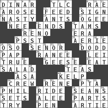 ACROSS 1. Middle Eastern gold or silver currency 6. Affectionate concern, for short 9. Actress Charlotte 12. Came up 13. Nourish 14. Omen 15. Offensive 16. Pismires 17. Double curve, resembling the letter S 18. Born 19. Extremities 20. Scottish caps 21. Western Nevada city 23. Epoch 24. Inconspicuous attention getter 25. Nest on high 28. Bear (Spanish) 30. Sir (Sp.) 34. Texas town _ City 35. Infant food 36. The wife of a rajah (variant) 38. Luau accessory 39. Loyal 41. Honkers 43. Consume 44. First course 46. Beverages made from leaves 48. White ___ sheet 49. Seaweed 50. Ship's personnel 51. French philosopher Descartes 53. Parent Teacher Assoc. 56. Silvers or Donahue 57. Travel on an animal 58. Seines 60. Puts into a specified state 61. Toward shelter 62. Pieces 63. Attempt 64. Animal enclosure 65. Nick name for Arthur DOWN 1. One of the 12 tribes of Israel 2. SW Asia republic 3. Olfactory organ 4. Michaelmas daisies 5. Marina Del _, California 6. Watch over 7. Allows 8. Music discs 9. Frustrating wastes of time 10. Grows older 11. Compass dir. 13. Papal veil 14. Flew 19. Keyboard key 20. Beverage made from leaves 22. Double-curved letter 24. Teen's desire 26. It may be bright or harebrained 27. Prepare for publication 28. Chooses 29. "Two Mules for Sister ____" 31. Tired old horse 32. Single 33. To riddle 37. First name in cosmetics 40. Artist's stands 42. Snakelike fish 45. Obsolete 47. Become visible 49. Leg joint 50. "Mermaids" star 51. Cause heat under the collar 52. Paradise 54. Small pie 55. Against 56. Pacific Standard Time (abbr.) 57. Reproach for some lapse or misdeed 58. Health resort 59. Compass dir.