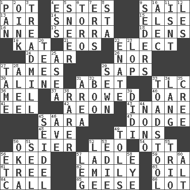 ACROSS 1. Plant holder 4. _____ Park, CO 9. Move on water 13. Wind 14. Derisive sound 15. Otherwise 16. Compass dir. 17. Spanish missionary in California 18. Hiding places for outlaws 19. Krazy ___ of comics 21. Greek goddess of the dawn 22. Voters do this 24. Letter starter 26. And not 27. Corrects by punishment or discipline 29. Plant excrements 30. Place in a line 31. Collude with 33. Affectionate concern, for short 36. Cartoonist voice _ Blanc 37. Moved like an arrow 40. Rowing implement 41. Snakelike fish 42. A really long time 43. Silly 45. "Two Mules for Sister ____" 47. Evade 48. First lady 49. Metal containers 50. Flexible twig of a willow tree 52. Lion 54. Baseball player Mel 56. Supplemented with great effort 57. Dipping utensil 59. Mouth or opening 61. Family _ (genealogy) 62. Poet Dickinson 63. Petroleum 64. Give a ring to 65. Honkers 66. Car dealer's back yard DOWN 1. Baking dish 2. Pig sound 3. Excercise machine 4. Double-curved letter 5. Scornful expression 6. "Corrida" creature 7. Blunders 8. R.R. building 9. Spring feasts 10. Actor Baldwin 11. Is not 12. French article 20. Adolescent 22. Maternal 23. Trim (branches) 25. At sea 27. Docile 28. Toward shelter 29. Stitched 31. Type of rug 32. Oct. 31 cry 33. Inedible or poisonous agaric 34. Long (Scottish) 35. Algonquian 38. More valued for its uncommonness 39. "You Light Up My Life" star Conn 44. Words to Nanette 45. A glass for beer 46. "___ Maria" 49. For Whom the Bell _____ 50. Gumbo ingredient 51. Sew up the eyelids of hawks and falcons 52. Unable to walk 53. Singer Brickell 55. Musical group of three 56. And so on (abbr.) 57. Part of a journey 58. Sight organ 60. The first octave above the treble staff