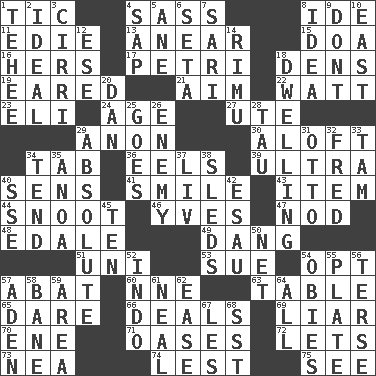 ACROSS 1. Nervous spasm 4. Backtalk 8. Binary compound 11. Singer Brickell 13. Approach 15. ___ good deed 16. Possessive pronoun 17. _ dish (used to culture cells) 18. Hiding places for outlaws 19. Having ears or earlike features 21. Direct toward a target or goal 22. Electrical Unit 23. Biblical high priest 24. Grow older 27. Shoshoni 29. At once, immediately (arch.) 30. Upward 34. Bar bill 36. Snakelike fish 39. Extreme 40. Elected reps. 41. Grin 43. A whole individual unit 44. Snob 46. Jacques Cousteau's middle name 47. Lower and raise head in agreement 48. Peak District village in England 49. Mild oath, euphamism for damn 51. Single; one (prefix) 53. Take to court 54. Elect 57. Blind as ____ 60. Compass dir. 63. Eating place 65. Have the gumption 66. Allots cards 69. One who doesn't tell the truth 70. Compass dir. 71. Fertile tracts in a desert 72. Allows 73. Teachers' org. 74. For fear that 75. Observe DOWN 1. Giggle 2. Standard of perfection 3. High-altitude cloud 4. Plant excrement 5. One (Scot) 6. Stalk of a moss capsule 7. Indian skirt 8. The main thing one is thinking about 9. Do not 10. Compass direction 12. Compass dir. 14. Tall New Zealand timber tree 18. Home 20. One of the 12 tribes of Israel 25. Moves 26. Foe 28. The 19th letter of the Greek alphabet 29. Utter; complete 31. "Beetle Bailey" pooch 32. Flintstone 33. Scottish cap 34. Look after 35. Small Philippine buffalo 37. 54 in ancient Rome 38. Bobsleighs 40. Compass dir. 42. He sold his birthright 45. Nine, plus one 50. Fish or hair follower 52. Southeast Asian peninsula 54. Off-Broadway awards 55. Food holder 56. Laconic 57. An important port of Yemen 58. Object of repulsion 59. Type of rug 61. Anneal 62. Relaxation 64. 100% 67. French article 68. Fast jet (abbr.)