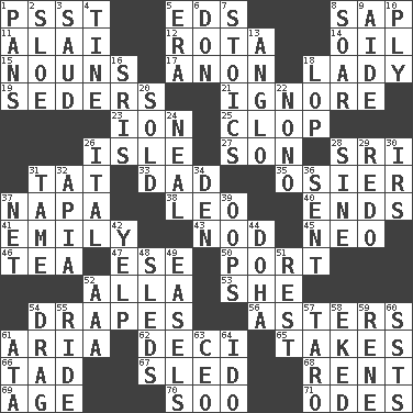 ACROSS 1. Inconspicuous attention getter 5. Begley and Asner 8. Plant excrement 11. Jai ____ 12. Roll call or roster of names 14. Petroleum 15. Parts of speech 17. At once, immediately (arch.) 18. Kenny Rogers chart-topper in '80 19. Spring feasts 21. Fail to notice 23. Electrically charged atom 25. Hoof sound 26. Capri or Wight 27. Boy, to dad 28. Indian title of respect (Mr.) 31. Make lace 33. June honoree 35. Flexible twig of a willow tree 37. California wine valley 38. Lion 40. Conclusions 41. Poet Dickinson 43. Dreamland 45. Modern: prefix 46. Afternoon social gathering 47. Compass dir. 50. Sweet dark-red dessert wine 52. Silent film actress Nazimova 53. A female animal or person 54. Window treatments 56. Michaelmas daisies 61. Operatic vocal solo 62. Tenth: prefix 65. Proceeds 66. Small boy 67. Downhill vehicle 68. Monthly bill 69. Grow older 70. "Barney Miller" actor Jack 71. Lyric poems DOWN 1. Zero-star reviews 2. A type of plum 3. Saudi Arabian king (1953-1964) 4. Prong on a fork 5. Epoch 6. Spanish title 7. Unemotional ones 8. Fly high 9. Assistant 10. Apply oneself diligently 13. White American of non-Hispanic descent 16. Indian titles of respect 18. Chop off 20. Disposed of to a purchaser 22. Words to Nanette 24. Anneal 26. Slanted text style (abbr.) 28. Trig term 29. Do over again 30. Big collection agency 31. Not wild 32. Capital of Western Samoa 34. Lair 36. Posted 37. Fish or hair follower 39. I made a mistake 42. Sharp bark 44. Capital of the state of Qatar 48. Bobsleighs 49. Artist's stands 51. Respite 52. American Automobile Association (abbr.) 54. To be drawn or hauled along 55. Travel on an animal 57. Pacific island yam 58. Supplemented with great effort 59. French philosopher Descartes 60. Fast planes 61. _ moment's notice (2 wds.) 63. Corporate head (abbr.) 64. Wedding promise