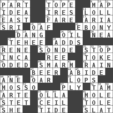 ACROSS 1. Role in a play 5. Drink excessively 9. Atlas unit 12. The content of cognition 13. Angers 14. Hang loosely or laxly 15. 90 degrees 16. Conductor's collection 17. Operatic vocal solo 18. _ Lanka 19. Clumsy lout 21. Dark wood 22. Mild oath, euphamism for damn 24. Petroleum 26. Teachers' org. 27. Giggle 28. Sums up 29. French philosopher Descartes 30. Something which is sent 32. Cease 36. South American Indian 37. To riddle 38. Puff or smoke 39. Wrote a lyric poem 40. Excessive but superficial compliments 42. Precipitation 43. Fermented drink made from hops 44. Tolerate 46. A saturated hydrocarbon 49. Rowing implement 50. Chops off 51. With motion or animation 53. Travel a route regularly 54. Scottish cap 57. Johnson of "Laugh-In" 58. Rounded earthenware pot or jar 61. Undercover agent 62. Proofreading order 63. To provide with a ceiling 64. Lacquered or enameled metalware 65. A female animal or person 66. Periodic rise and fall of the sea level 67. Narrow board DOWN 1. Sliced desserts 2. The sixth month of the Jewish calendar 3. Home 4. Make lace 5. Small quarrel 6. Mouth or opening 7. For each 8. Compass dir. 9. Person of subnormal intelligence 10. Place in a line 11. Beach, in Buenos Aires 14. Experiment locale 19. Single 20. Grows older 21. Raised railways 23. Forward in time 24. More peculiar 25. Binary compound 27. Be inclined (to) 28. Approach 29. _ de Janeiro 31. Channel Islands abalone 32. Long narrow piece of something 33. Inedible or poisonous agaric 34. Migrant worker of the '30s 35. Writing instrument 40. Ocean 41. Shopping center 43. Surprise greeting 45. Male child 46. Collect or gather 47. Compass direction 48. First name in cosmetics 52. Put into a specified state 53. Light colored 55. Silent film actress Nazimova 56. Confront 58. Sep. follower 59. Flowery wreath 60. Hat (slang) 61. Mountains (abbr.)