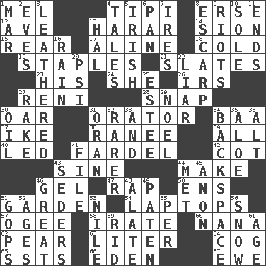ACROSS 1. Cartoonist voice _ Blanc 4. Native american tent (variation) 8. Celtic language 12. "___ Maria" 13. Ethiopian city, capital of Harari 14. The Jewish people; Israel 15. Bring up, as a child 17. Place in a line 18. Having a low temperature 19. Paper fasteners 21. Chalkboards 23. Part of HMS, perhaps 24. A female animal or person 26. Big collection agency 27. Painter Guido (1575-1642) 28. Fastener 30. Rowing implement 31. Speaker 34. Sound made by sheep 37. Eisenhower's nickname 38. The wife of a rajah (variant) 39. 100% 40. Directed 41. Bundle 42. Small bed 43. Trig term 44. Create 46. Set 47. Strike 50. Followers of ems 51. Place where plants grow 54. Portable computers 57. Double curve, resembling the letter S 58. Feeling or showing extreme anger 60. Nanny 62. Lightbulb-shaped fruit 63. 61 cubic inches 64. Gear tooth 65. Fast planes 66. Genesis locale 67. She-sheep DOWN 1. Impair 2. Nights before holidays 3. Tough but pliablecoriaceous 4. Falsehoods 5. From or relating to Ireland 6. Baking dish 7. Angers 8. Fortification 9. Debaucheries 10. Flatfish 11. Conclusions 13. Actor Linden 16. Water falling in drops from the sky 20. Air pressure measure (abbr.) 22. One who doesn't tell the truth 25. First name in cosmetics 27. Libertine 29. Christmas carol 30. Petroleum 31. NW Algerian seaport 32. More valued for its uncommonness 33. Also 34. Keyboard key 35. _ vera 36. Keyboard modifier key 41. Do some clerical work 43. Spring feasts 44. Was introduced to 45. Soon (poet.) 46. Relatively large 48. Having winglike extensions 49. Eucharist need 51. Republicans 52. Ripens 53. The longest river in the world 55. For each 56. Overwhelm 59. To free from 61. Ripen