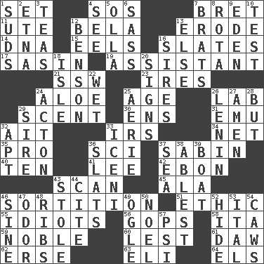 ACROSS 1. Arrange properly for use 4. Mayday 7. Cy Young winner Saberhagen 11. Shoshoni 12. Actor Lugosi 13. Wear away 14. Heredity factor (abbr.) 15. Snakelike fish 16. Chalkboards 17. Indian antelope 19. Aide 21. Compass dir. 23. Angers 24. _ vera 25. Ripen 26. Experiment locale 29. Aroma 30. Followers of ems 31. Australian flightless bird 32. Small island 33. Big collection agency 34. Remaining after all deductions 35. Adept person 36. _-fi 37. Unit of acoustic absorption 40. Nine, plus one 41. Area sheltered from the wind 42. Inky black, to poets 43. Skim 45. According to 46. Conclusion 51. Moral principle 55. Foolish or stupid persons 56. Republicans 58. Call ___ day 59. Having high moral qualities 60. For fear that 61. Obsolete 62. Celtic language 63. Biblical high priest 64. Raised railways DOWN 1. Beer foam 2. Inactive volcano in Sicily 3. Beverages made from leaves 4. Observe 5. Spanish pot 6. Backtalk 7. Naughty children 8. Round or rotation of duties 9. Paradise 10. Trial 12. Gillaume's butler role 13. Otherwise 16. Male parents of animals 18. Capri or Wight 20. Signals 22. Dripping 24. 13-14th century defensive garment 25. Nest on high 26. Soviet premier 1918-24 27. So be it 28. On the contrary 29. Father 32. Fitting 33. Ancient Celtic tribe of eastern Britain 36. Narrow boards 37. Ocean 38. Most capable 39. Water vessel 43. Fur scarf 44. Quote 46. Trig term 47. Aroma 48. Teases 49. Stare 50. Christmas carol 52. Flintstone garb 53. Slanted text style (abbr.) 54. Crow sounds 57. 23rd letter of the Greek alphabet