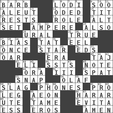 ACROSS 1. Sharp remark 5. Farming town in central California 9. "Barney Miller" actor Jack 12. Eskimo relative 14. Wrote a lyric poem 15. Teat (slang) 16. Musical pauses 17. Hero or heavy, e.g. 18. The first octave above the treble staff 19. Put into a specified state 20. Electrical Unit 23. In addition 24. Mountain range 25. Loyal 27. Prejudice 30. Make lace 32. Snakelike fish 33. Single time 34. Play the lead 36. Begley and Asner 38. Boat paddle 39. Period 40. _ Mahal 43. Biblical high priest 46. Fast planes 48. Short letter 49. Mouth or opening 51. One more than two 52. Argument over a trivial matter 53. Fastener 54. Norwegian king 56. Volcanic refuse 58. Gives a jingle 61. Adept person 64. Part of a journey 65. A really long time 66. Ethiopian city, capital of Harari 68. Shoshoni 69. Not wild 70. Webber/Rice musical 71. Curvy letter 72. Greek god of love 73. So be it DOWN 1. Oblong pieces of solid material 2. Toward shelter 3. Relief 4. On the contrary 5. Old wives' tales, e.g. 6. Aroma 7. Erase 8. Binary compound 9. Showing deterioration from age 10. Lubricates 11. "Beetle Bailey" pooch 13. Russian ruler of old 21. Floor protectors 22. Food holders 23. Old (Scot.) 24. Purpose 26. To riddle 27. Oct. 31 cry 28. _ tizzy (2 wds.) 29. Land measure 31. Tarsus (plural) 35. Food allowance for one day 37. Close up, plug up 41. "One Day ___ Time" 42. _ stream 44. Protracted 45. Retirement account (abbr.) 47. Filth; sediment 48. Overdraft (abbr.) 50. Seem 53. Gurus 55. American tennis player Robert 56. Turn sharply 57. Allows 59. Like (prefix) 60. Singles 61. Demure 62. Assign a rank or rating to 63. Northwest Algerian city 65. Had dinner 67. Actress Gardner