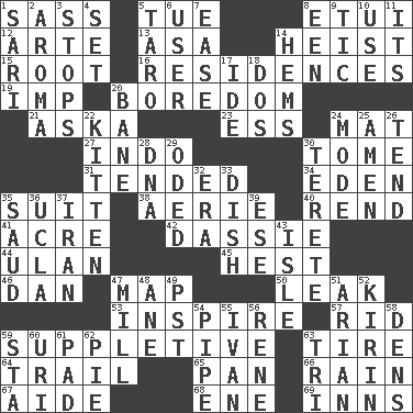ACROSS 1. Backtalk 5. Third day of the wk. 8. Needle case 12. Johnson of "Laugh-In" 13. White ___ sheet 14. Robbery 15. Carrot, for example 16. Dwellings 19. Naughty child 20. Mood resulting from idleness 21. "____ silly question..." 23. Double-curved letter 24. Floor protector 27. Southeast Asian peninsula 30. Heavy book 31. Watched over 34. Locale of original sin 35. Set of matching outer garments 38. Nest on high 40. Tear apart 41. Measure of real estate 42. Hyrax 44. ____ Bator 45. Command 46. Daniel's nick name 47. Atlas unit 50. Path through which fluid escapes 53. Heighten or intensify 57. To free from 59. Supplying deficiencies 63. Become fatigued 64. Go after with the intent to catch 65. Baking dish 66. Precipitation 67. Helper 68. Compass dir. 69. Lodging establishments DOWN 1. Indian skirt 2. Odor 3. Halts 4. Arrange properly for use 5. Edible starchy tuberous root 6. One who makes use of a thing 7. Comfort 8. Car or cant ending 9. Nervous spasm 10. Purpose 11. ___ a Wonderful Life 14. Is hesitant and indecisive 17. Binary compound 18. Two (Sp.) 20. Object of repulsion 22. Baby cat 24. Method 25. So be it 26. Be inclined (to) 28. Heredity factor (abbr.) 29. Wrote a lyric poem 30. Cylindrical with tapered ends 32. Period 33. Food container 35. Saudi Arabian king (1953-1964) 36. Southern CA. univ. 37. SW Asia republic 39. Compass dir. 43. Small island 47. Place where flour is made 48. A saturated hydrocarbon 49. Pacific Standard Time (abbr.) 51. Believer in; advocate of (suffix) 52. Japanese brewing company 54. Corncob 55. "Terrible" tsar 56. French philosopher Descartes 58. Hiding places for outlaws 59. R.R. building 60. RI univ. 61. Groovy apt. 62. Sliced dessert 63. Three (prefix)
