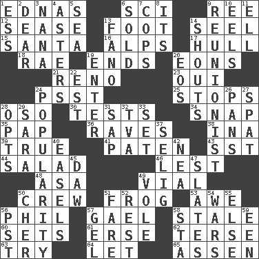 ACROSS 1. Ferber et al. 6. _-fi 9. To sift 12. Gospel singer Marvin 13. 12 inches 14. Sew up the eyelids of hawks and falcons 15. Before Barbara or Clara 16. High mountains 17. Frame or body of a ship 18. Actress Charlotte 19. Conclusions 20. Immeasurably long periods of time 21. Former U.S. Attorney General Janet 23. Fr. "Yes" 24. Inconspicuous attention getter 25. Ceases 28. Bear (Spanish) 30. Trials 34. Fastener 35. Infant food 36. All-night dance parties 38. _ tizzy (2 wds.) 39. Loyal 41. Eucharist need 43. Fast jet (abbr.) 44. Vegetable dish 46. For fear that 48. White ___ sheet 49. Small bottle 50. Group working together 51. Tree-dwelling hopper 53. Deep reverence 56. Silvers or Donahue 57. Highlander 58. Showing deterioration from age 60. Arranges properly for use 61. Celtic language 62. Laconic 63. Attempt 64. Allow 65. NE Netherlands city DOWN 1. Curvy letter 2. Letter starter 3. Nanny 4. Michaelmas daisies 5. Ocean 6. Exchanged or delivered for money 7. 911 reaches them 8. It is 9. One who advocates reunion 10. Snakelike fish 11. Pipe bend 13. Papal veil 14. Yells 19. Keyboard key 20. Greek goddess of the dawn 22. Eastern Standard Time (abbr.) 24. Teen's desire 26. Zero-star reviews 27. Argument over a trivial matter 28. Elects 29. "Two Mules for Sister ____" 31. Plant excrement 32. Federal power corp. 33. Arrange properly for use 37. Former Milwaukee Brewers owner Bud 40. Artist's stands 42. Teachers' org. 45. Fool 47. Chalkboards 49. Grand slam 50. "Mermaids" star 51. Conductor's collection 52. Relief 54. Armed conflicts 55. Otherwise 56. Pacific Standard Time (abbr.) 57. Set 58. R.R. building 59. Car or cant ending