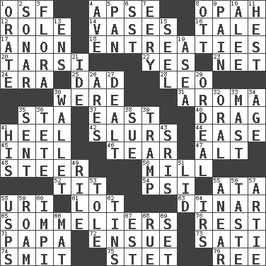 ACROSS 1. Order of Saint Francis (abbr.) 4. Domed church section 8. Brightly colored fish 12. Hero or heavy, e.g. 14. Flower holders 16. Story 17. Soon (poet.) 18. Pleas 20. Tarsus (plural) 22. It is so 23. Fish or hair follower 24. Period 25. Male parent 28. Lion 30. Past tense of be (plural) 31. Scent 35. R.R. building 37. Compass direction 40. To be drawn or hauled along 41. The bottom of a shoe or boot 42. Plays smoothly or legato 44. Relaxation 45. International (abbr.) 46. Lacerate 47. Keyboard modifier key 48. Navigate 50. Place where flour is made 52. Teat (slang) 54. 23rd letter of the Greek alphabet 55. "One Day ___ Time" 58. RI univ. 61. Car dealer's back yard 63. Middle Eastern gold or silver currency 65. Wine waiters 70. Take ten 71. Dad 72. Take place subsequently 73. Suttee (variant) 74. Stricken, poetically 75. Proofreading order 76. Portuguese money of account (variant) DOWN 1. Declaim 2. Echolocation 3. Plants 4. "___ Maria" 5. Baking dish 6. Fast jet (abbr.) 7. Suggestive of the supernatural 8. Baseball player Mel 9. Ache 10. Toward shelter 11. Behest 13. Followers of ems 15. Sew up the eyelids of hawks and falcons 19. Toward the sea 21. Binary compound 26. Ancient Greek god of war 27. Started a card game 29. Severe or trying experience 30. Place for singles 32. Of the mouth 33. Vertical spar for supporting sails 34. Personal question 35. Emitted 36. Wig 38. Take to court 39. _____ steamer (cargo ship) 41. Part of HMS, perhaps 43. Indian titles of respect 49. Cause heat under the collar 51. Flaplike covering 53. Lacquered or enameled metalware 55. Approach 56. Clothes sense 57. Nick name for Arthur 58. United States Postal Service (abbr.) 59. Wander 60. Body of Kaffir warriors 62. Airtight sealed metal containers 64. Big collection agency 66. Floor covering 67. Eastern Standard Time (abbr.) 68. Regret 69. Put into a specified state