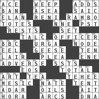 ACROSS 1. Adept person 4. Shed a tear 8. Does sums 12. Bar 13. Toward the sea 14. Ketch in the Levant 15. Flair 17. Painter Guido (1575-1642) 18. Role for Stallone 19. Lugs 21. Compass dir. 23. Pacific Standard Time (abbr.) 24. Musical pauses 26. Arrange properly for use 28. Baby powder 30. Person of authority 34. English channel? 37. Capital and largest city of Mongolia 39. Connecting point 40. Snakelike fish 41. Honkers 43. "___ Little Indians" 44. Den 46. Entreaty 47. Compass dir. 48. Contrary to your interests or welfare 51. Fast planes 54. Greek goddess of the dawn 55. "_____ Recall" 58. Tate display 61. Afternoon social gathering 63. Giggle 65. Mesonic 67. Nathan's nickname 71. Portable shelter 72. The sixth month of the Jewish calendar 73. Lubricates 74. Small island 75. Israeli folk dance 76. Curves 77. Heredity factor (abbr.) DOWN 1. Collude with 2. Bodily heat indicating an inflammation 3. Maternal 4. Armed conflict 5. Compass dir. 6. Car or cant ending 7. Ache 8. White ___ sheet 9. Moist 10. Claim 11. Highlander 16. A home for chicks 18. Coral ridge 20. R.R. building 22. Overdraft (abbr.) 25. Snaillike creature with no shell 27. Shallow baking pan 29. Streamer paper 30. Fertile tracts in a desert 31. ____ d'Azur (French Riviera) 32. Paradise 33. French philosopher Descartes 34. Actor Lugosi 35. Necklace unit 36. 154 in Roman numerals 38. Set 42. 90 degrees 45. To separate or throw off 49. College mil. group 50. Compass dir. 52. Small child 53. Proofreading order 56. Toward the future 57. Soviet premier 1918-24 58. Nursemaid 59. Do over again 60. Russian ruler of old 62. Small Philippine buffalo 64. Singer James 66. Retirement account (abbr.) 68. Wind 69. Affectionate concern, for short 70. Curvy letter