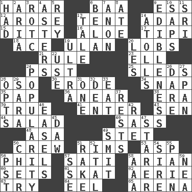 ACROSS 1. Ethiopian city, capital of Harari 6. Sound made by sheep 9. Double-curved letter 12. Came up 13. Portable shelter 14. The sixth month of the Jewish calendar 15. Short, simple song 16. Medicinal plant 17. Native american tent (variation) 18. Adept person 19. Uhlan (variant) 20. Tennis shots 21. General guideline 23. Pipe bend 24. Inconspicuous attention getter 25. Bobsleighs 28. Bear (Spanish) 30. Wear away 34. Fastener 35. Infant food 36. Approach 38. Epoch 39. Loyal 41. Keyboard key 43. Elected rep. 44. Vegetable dish 46. Backtalk 48. White ___ sheet 49. Proofreading order 50. Ship's personnel 51. Basketball hoops 53. Viper 56. Silvers or Donahue 57. Suttee (variant) 58. Believer in; advocate of (suffix) 60. Puts into a specified state 61. Three-handed card game 62. Nest on high 63. Attempt 64. Snakelike fish 65. Sports stadium DOWN 1. Possessed 2. Roberta Peters solo 3. College mil. group 4. Michaelmas daisies 5. Marina Del _, California 6. Actor Lugosi 7. At once, immediately (arch.) 8. Had dinner 9. The property of being fit to eat 10. Plant excrements 11. Indian title of respect (Mr.) 13. Story 14. Ringlike coral islands and reefs 19. Extreme 20. French article 22. Purpose 24. Teen's desire 26. Have the gumption 27. Connect, as a bridge 28. Chooses 29. "Two Mules for Sister ____" 31. Single 32. Lair 33. Ingest 37. Musical pauses 40. Artist's stands 42. Actress Charlotte 45. Fool 47. A viewer who gazes fixedly 49. Stricken, poetically 50. "Mermaids" star 51. Libertine 52. Slanted text style (abbr.) 54. Male parent of an animal 55. Ache 56. Pacific Standard Time (abbr.) 57. Compass dir. 58. American Automobile Association (abbr.) 59. Teachers' org.