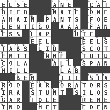 ACROSS 1. Otherwise 5. A saturated hydrocarbon 8. Feline 11. Passed on 12. Nathan's nickname 14. Single 15. At full speed 17. Leg coverings 18. Enemy 19. Small, flat, pigmented spot on the skin 21. American Automobile Association (abbr.) 22. Avid follower 23. Curvy letter 24. Infant locale 25. Shoshoni 27. Snakelike fish 28. Snakelike fish 31. Bar bills 35. Flaplike covering 37. Highlander 38. Give off 39. Compass dir. 41. Ballerina skirt 42. Root beer relative 43. Everything 45. Connect, as a bridge 46. Land elevation 47. Experiment locale 49. Benjamin's nick name 51. One more than two 52. R.R. building 55. Friend of Pooh 57. Hearing organ 60. Speakers 62. Retirement account (abbr.) 63. Difficult or unusual or dangerous feat 65. Grain storage towers 66. Slender fish 67. Lacquered or enameled metalware 68. French philosopher Descartes 69. Indiana (abbr.) 70. Was introduced to 71. Paradise DOWN 1. Peak District village in England 2. Citrus fruits 3. Actors Connery and Penn 4. Prepare for publication 5. Santa ___, CA 6. Grandmother 7. Singer James 8. Java holder (2 wds.) 9. Small Philippine buffalo 10. Adolescent 13. Son of Isaac 16. Mediterranean tributary 17. Cotton for raincoats, e.g. 20. Highlander 26. Trials 29. Globular water bottle used in Asia 30. Surprise greatly 31. Technical 32. Mine, in Marseilles 33. Big road sign 34. Showing deterioration from age 36. Heredity factor (abbr.) 40. American author Paul (1891-1958) 44. Den 48. Prejudice 50. Egg locale 52. Having a sole or soles 53. Marketplace scale 54. NE Netherlands city 55. Swiss mountan, "Queen of the Mountains" 56. NW Algerian seaport 58. Smallest unit of an element 59. General guideline 61. Become fatigued 64. Fish or hair follower