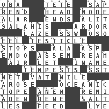ACROSS 1. Chief or king in Benin or Nigeria 4. Wig 8. Plant excrement 11. Former U.S. Attorney General Janet 13. Froth on beer 14. Method 15. Having or resembling wings 16. Conclusions 17. Set down 18. Deli grouping 21. Zeal 22. Goldbrick 23. Compass dir. 25. Bear (Spanish) 26. Snakelike fish 29. One of the two male reproductive glands 32. Constricts 34. In the manner of 35. Cleo's killer 38. Inside; within (prefix) 39. NE Netherlands city 41. 480, 500 or 516 sheets of paper 43. Atmosphere 44. Allow 45. Lacking in sense or substance 46. Storms 50. Fast jet (abbr.) 51. Remaining after all deductions 54. Large container 55. The longest river in the world 57. Came up 59. Pertaining to the sea 63. Drink excessively 64. Afresh 67. Painter Guido (1575-1642) 68. An important port of Yemen 69. French philosopher Descartes 70. Table seasoning 71. French article 72. Nourish 73. Potassium hydroxide DOWN 1. Mouths or openings 2. Actor Lugosi 3. Of or related to the anus 4. College papers 5. Car or cant ending 6. Bit 7. Begley and Asner 8. Twentieth part of a lira 9. Goodbye (Sp.) 10. Stone: prefix 12. Relating to the mouth 14. Spoil 19. Floor coverings 20. Ending with capital 21. Leather borer 23. Filth; sediment 24. Skim 26. Compass dir. 27. Inactive volcano in Sicily 28. Farming town in central California 30. Clothes sense 31. Merit 33. Sweet dark-red dessert wine 36. Oceans 37. Zero-star reviews 39. _ mater 40. Back-to-school mo. 42. Was introduced to 45. Small island 47. Night before a holiday 48. Overwhelmed 49. Nervous spasm 51. Brizilian seaport 52. Eat (away) 53. Drinks excessively 56. Hearing organs 58. Elected rep. 60. Be tempered by heat 61. Inwardly 62. Quote 64. Sandy's bark 65. Born 66. Compass dir.