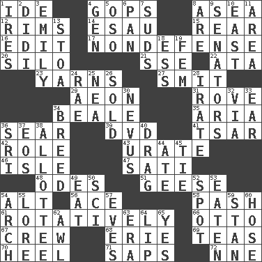 ACROSS 1. Binary compound 4. Republicans 8. At sea 12. Basketball hoops 14. He sold his birthright 15. Tail end 16. Prepare for publication 17. Unrelated to defense, as in spending 20. Grain storage tower 21. Compass dir. 22. "One Day ___ Time" 23. Tall tales 27. Stricken, poetically 29. Period of immesurable duration 31. Be footloose 34. Memphis, Tenn. Street 35. Operatic vocal solo 36. Dry up 39. Movie disc 41. Russian ruler of old 42. Hero or heavy, e.g. 43. A salt of uric acid 46. Small island 47. Suttee (variant) 48. Lyric poems 51. Honkers 54. Keyboard modifier key 56. Adept person 58. Romantic infatuation 61. Happening in regular succession 66. Von Bismarck 67. Group working together 68. 4th largest of the Great Lakes 69. Afternoon social gatherings 70. Person who is morally reprehensible 71. Plant excrements 72. Compass dir. DOWN 1. Angers 2. "You Light Up My Life" star Conn 3. Poet Dickinson 4. Commissioned mil. rank 5. Bear (Spanish) 6. Baking dish 7. Soap bubbles 8. "We ___ not amused" (Victoria) 9. Legislators 10. Compass direction 11. Length times width 13. Portico 18. Curvy letter 19. Opposite of masc. 24. Actress Charlotte 25. Teachers' org. 26. Exchanged or delivered for money 28. Feeling or showing extreme anger 30. Mole, birthmark 32. By way of 33. Ewer handle 34. A special lineage 36. Indian title of respect (Mr.) 37. Greek goddess of the dawn 38. One to whom something is allotted 40. To trail on the ground 44. Had dinner 45. Standoff 49. Erode 50. _-fi 52. Blemish 53. Ingested 54. Bowlike part 55. Old wives' tales, e.g. 57. Nights before holidays 59. Comedian Laurel of Laurel & Hardy 60. Flexible conduit 62. Leather borer 63. Period 64. Mouth edge 65. It is so