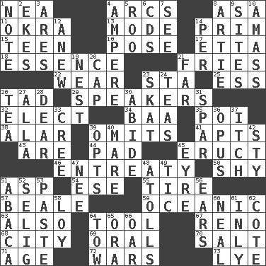 ACROSS 1. Teachers' org. 4. Curves 8. White ___ sheet 11. Gumbo ingredient 13. Method 14. Demure 15. Adolescent 16. Introduce or present, as a question 17. Singer James 18. Substance 21. Strips of potato fried in deep fat 22. Erode 23. R.R. building 25. Curvy letter 26. Small amount or degree 29. Orators 32. Opt 34. Sound made by sheep 35. Luau course 38. Having or resembling wings 39. Leaves out 41. Tenement units (abbr.) 43. "We ___ not amused" (Victoria) 44. Groovy apt. 45. Spew [out] 46. Plea 50. Like a shrinking violet 51. Cleo's killer 54. Compass dir. 55. Hoop that covers a wheel 57. Calif. Air Force Base 59. Pertaining to the sea 63. In addition 64. Utensil 67. Former U.S. Attorney General Janet 68. Municipality 69. Taken by mouth 70. Table seasoning 71. Grow older 72. Armed conflicts 73. Potassium hydroxide DOWN 1. Short letter 2. Supplements with great effort 3. Ancient Greek god of war 4. Electrical Unit 5. Friend of Pooh 6. Music discs 7. Perceive with the eye 8. Nick name for Arthur 9. Locates 10. Collect or gather 12. Afresh 14. For each 19. A home for chicks 20. Head covering 21. At a great distance 23. Three-handed card game 24. Beverages made from leaves 26. Beverage made from leaves 27. Silent film actress Nazimova 28. Letter starter 30. Remain 31. Coast Guard woman 33. Algonquian 36. Musical composition 37. Hankering 39. Elects 40. Female horse 42. Filthy place 45. Jane of fiction 47. Born 48. Ringlike coral islands and reefs 49. Nervous spasm 51. Phillipine bananalike plant 52. Former Milwaukee Brewers owner Bud 53. Thick mixture 56. Hearing organs 58. Myrna of the movies 60. Anneal 61. In an inward manner 62. ____ d'Azur (French Riviera) 64. Pull behind 65. Mouth or opening 66. Rowing implement