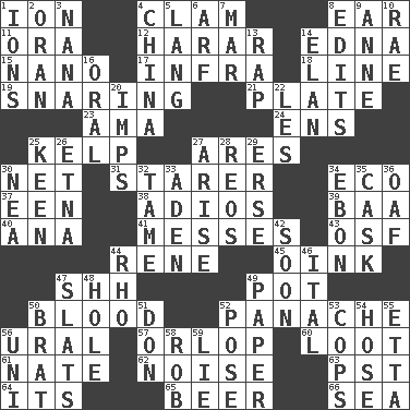 ACROSS 1. Electrically charged atom 4. Burrowing marine mollusk 8. Ewer handle 11. Mouth or opening 12. Ethiopian city, capital of Harari 14. Pulitzer Prize-winning author Ferber 15. Billionth: prefix 17. Kind of red light 18. Actor's bit 19. Catching in a trap 21. Food holder 23. Nursemaid (var.) 24. Followers of ems 25. Seaweed 27. Ancient Greek god of war 30. Remaining after all deductions 31. A viewer who gazes fixedly 34. Environmental prefix 37. Car or cant ending 38. Goodbye (Sp.) 39. Sound made by sheep 40. Santa ___, CA 41. Makes clutter 43. Order of Saint Francis (abbr.) 44. French philosopher Descartes 45. Pig sound 47. Quiet! 49. Plant holder 50. Vital fluid 52. Flamboyance 56. Mountain range 57. Fourth or lowest deck 60. Spoils 61. Nathan's nickname 62. Annoying sound 63. Pacific Standard Time (abbr.) 64. It is 65. Fermented drink made from hops 66. Ocean DOWN 1. Charged particles 2. Northwest Algerian city 3. Grandmother 4. Large country 5. Austrian-born American filmmaker Fritz 6. Sandy's bark 7. Impair 8. Proofreads 9. Singer Murray 10. Actress Charlotte 13. Reproach for some lapse or misdeed 14. Style 16. Relating to the mouth 20. Naughty children 22. French article 25. Peachy ____! 26. Inactive volcano in Sicily 27. Ascend 28. Vintage cars 29. Celtic language 30. Teachers' org. 32. Docile 33. Arabian gulf 34. Inky black, to poets 35. Keg 36. Clumsy lout 42. Within a short period 44. 17th letter of the Greek alphabet 46. Slanted text style (abbr.) 47. Narrow boards 48. Hollow 49. Some stationery 50. Naughty child 51. Spanish title 52. Airs 53. 911 reaches them 54. Flexible conduit 55. Singer James 56. Single; one (prefix) 58. Director Reiner 59. Falsehood