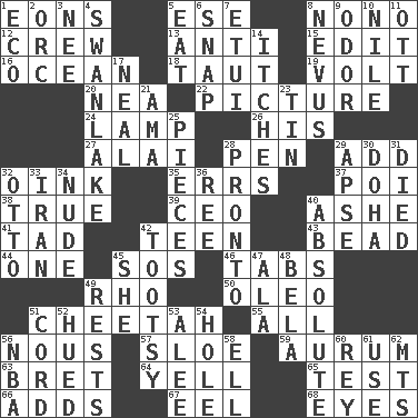 ACROSS 1. Immeasurably long periods of time 5. Compass dir. 8. Words to Nanette 12. Ship's personnel 13. Opposed to 15. Prepare for publication 16. Sea 18. Drawn tight 19. Electrical Unit 20. Teachers' org. 22. Photo 24. Desk light 26. Part of HMS, perhaps 27. Jai _ 28. Fenced enclosure 29. Increase 32. Pig sound 35. Blunders 37. Luau course 38. Loyal 39. Corporate head (abbr.) 40. American tennis player Robert 41. Small boy 42. Adolescent 43. Necklace unit 44. Single 45. Distress signal 46. Bar bills 49. 17th letter of the Greek alphabet 50. Margarine 51. Leopard's kin 55. 100% 56. Good sense 57. _ gin 59. Gold (Symbol: Au) 63. Cy Young winner Saberhagen 64. Shout 65. Trial 66. Does sums 67. Snakelike fish 68. Sight organs DOWN 1. Environmental prefix 2. The grampus (Milton) 3. Born 4. Tchaikovsky ballet 5. Consume 6. Fastener 7. Needle case 8. Mole, birthmark 9. Aroma 10. The longest river in the world 11. Baseball player Mel 14. Strong, restless desires 17. Actress Patricia 21. Nursemaid (var.) 23. Shallow baking pan 25. Components 28. Right away 29. Domed church section 30. Capital of the state of Qatar 31. Passed on 32. Von Bismarck 33. SW Asia republic 34. Naked 36. To riddle 40. Utter; complete 42. A girl or young woman (variant) 45. A female animal or person 47. Insect wing 48. Actor Lugosi 49. Musical pauses 51. Drawstring 52. Became colored 53. Toward shelter 54. Opening into or through something 56. Basketball assoc. 58. Pipe bend 60. Marina Del _, California 61. Purpose 62. Mountains (abbr.)