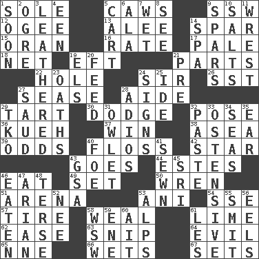 ACROSS 1. Not divided or shared with others 5. Crow sounds 9. Compass dir. 12. Double curve, resembling the letter S 13. Toward shelter 14. Coast Guard woman 15. Northwest Algerian city 16. Assign a rank or rating to 17. Diluted with white 18. Fish or hair follower 19. Bank Draft (abbr.) 21. Pieces 22. Hollow 24. Title for a knight 26. Fast jet (abbr.) 27. Gospel singer Marvin 28. Helper 29. Small pie 30. Evade 32. Airs 36. Malaysian steamed pastry 37. Acquire through effort 38. At sea 39. Probability 40. Soft thread for cleaning between teeth 42. Play the lead 43. Travels 44. _____ Park, CO 46. Ingest 49. Arrange properly for use 50. Songbird 51. Sports stadium 53. Black tropical American cuckoo 54. Compass dir. 57. Hoop that covers a wheel 58. Welt 61. Citrus frut 62. Comfort 63. Clip 64. Tending to cause great harm 65. Compass dir. 66. Moistens 67. Arranges properly for use DOWN 1. Within a short period 2. Legendary monster 3. Resembling or made to resemble leather 4. Car or cant ending 5. Draw slowly or heavily 6. Chicken ___ king 7. Soggy 8. Observe 9. Practice fights 10. Table seasonings 11. Take or capture by force 14. Health resort 19. Raised railways 20. Nourish 21. Before (prefix) 23. Profane or obscene expressions 24. Attaches a signature 25. Binary compound 27. Saudi Arabian king (1953-1964) 28. Goodbye (Sp.) 29. Ring climax 31. A small or young owl 32. Thick mixture 33. Clearly or manifestly demonstrative 34. Oceans 35. Ewer handle 40. Enemy 41. Stitched 43. Girls' org. (abbr.) 45. Indian title of respect (Mr.) 46. Eroded 47. Believer in; advocate of (suffix) 48. Laconic 52. Born 53. High mountains 55. Stricken, poetically 56. Snakelike fish 58. Compass dir. 59. Compass dir. 60. Small island 61. French article