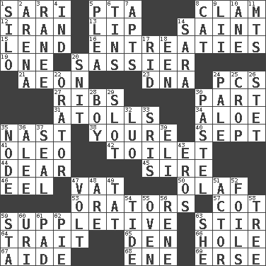 ACROSS 1. Indian skirt 5. Parent Teacher Association (abbr.) 8. Dollar (slang) 12. SW Asia republic 13. Mouth edge 14. Inhabitant of Heaven 15. Grant temporary use of 16. Pleas 19. Single 20. More disrespectful 21. A really long time 23. Heredity factor (abbr.) 24. Personal Computers (abbr.) 27. Teases 30. Component 31. Ringlike coral islands and reefs 34. Medicinal plant 35. Political cartoonist Thomas 38. You are 40. Back-to-school mo. 41. Butter sub 42. Bathroom 44. Letter starter 45. Beget 46. Snakelike fish 47. Large container 50. Norwegian king 53. Speakers 57. Small bed 59. Supplementary 63. Tumult 64. Distinguishing feature 65. Lair 66. Opening into or through something 67. Helper 68. Compass dir. 69. Celtic language DOWN 1. Grain storage tower 2. Sports stadium 3. The wife of a rajah (variant) 4. Indiana (abbr.) 5. Entreaty 6. Airtight sealed metal containers 7. Flats, for short 8. Domesticated feline 9. Cards in a Roman deck? 10. One (Scot) 11. Mountains (abbr.) 14. "Two Mules for Sister ____" 17. To free from 18. Car or cant ending 20. In a ____ (agitated or irritated) 22. Speaker 24. Light colored 25. Riding implement 26. Proofreading order 28. Male child 29. Narrow, elongated depression 30. Soft color 32. Nilotic language 33. Indian titles of respect 35. Connecting point 36. Toward shelter 37. Lick closed 39. Connecticut Ivy Leaguer 43. Greek god of love 47. Electrical Unit 48. "We ___ not amused" (Victoria) 49. Make lace 51. Thespian 52. Fencing necessities 54. Event that recurs at intervals 55. Baking chamber 56. French philosopher Descartes 58. Woody plant 59. R.R. building 60. RI univ. 61. Groovy apt. 62. Sliced dessert 63. A female animal or person