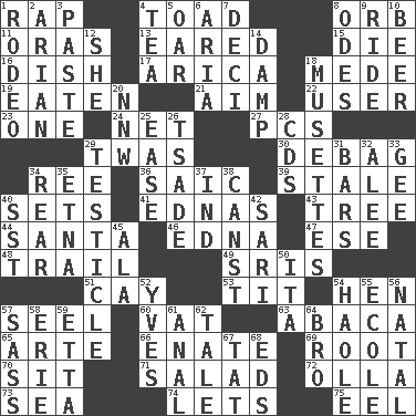 ACROSS 1. Hit sharply and swiftly 4. Frog relative 8. Globe 11. Mouths or openings 13. Having ears or earlike features 15. Pass on 16. Food container 17. N. Chile seaport 18. Ancient Persian 19. Ingested 21. Direct toward a target or goal 22. One who uses or employs something 23. Single 24. Remaining after all deductions 27. Personal Computers (abbr.) 29. It was, poetically 30. Debunk (Brit. slang) 34. Portuguese money of account (variant) 36. Ketch in the Levant 39. Having lost freshness 40. Puts into a specified state 41. Ferber et al. 43. Family _ (genealogy) 44. Before Barbara or Clara 46. Pulitzer Prize-winning author Ferber 47. Compass dir. 48. Lag or linger behind 49. Indian titles of respect 51. Island 53. Teat (slang) 54. Layer 57. Stitch closed the eyes of (a falcon) 60. Large container 63. Phillipine bananalike plant 65. Johnson of "Laugh-In" 66. Maternal 69. Carrot, for example 70. Be seated 71. Vegetable dish 72. Water jar 73. Ocean 74. Allows 75. Snakelike fish DOWN 1. Cowboy competition 2. Believer in; advocate of (suffix) 3. Thick mixture 4. Afternoon social gathering 5. Rowing implement 6. Operatic vocal solo 7. Tenth: prefix 8. Lyric poems 9. Travel on an animal 10. Fermented drink made from hops 12. A female animal or person 14. Moist 18. French bagpipes 20. Compass dir. 25. Comfort 26. Sadhe (variant) 28. Music discs 29. A testis 31. Soap units 32. Toward shelter 33. Unit of force equal to gravity 34. Bring up, as a child 35. Inactive volcano in Sicily 37. Indiana (abbr.) 38. 2nd pers. sing. pres. of can (arch.) 40. Fast jet (abbr.) 42. Indian skirt 45. Wing 50. Call ___ day 52. Jacques Cousteau's middle name 54. White Person, in Hawaii 55. Learning spot: Fr. 56. Brizilian seaport 57. Backtalk 58. One of the Great Lakes 59. Singer James 61. Of or related to the anus 62. Lie 64. Sis' sibling 67. Make lace 68. Begley and Asner