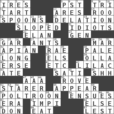 ACROSS 1. Angers 5. Pacific Standard Time (abbr.) 8. Three (prefix) 11. Small pie 12. Ancient Greek god of war 13. Friend of Pooh 14. Soup utensils 17. Conveyance 19. Had an oblique or slanted direction 21. Foolish or stupid persons 22. Style 23. Commissioned military rank (abbr.) 24. Slender fish 27. Pismires 29. Impair 32. Bee-related 34. Actress Charlotte 36. Diluted with white 37. Having great length 38. Raised railways 39. Rounded earthenware pot or jar 40. Celtic language 41. And so on (abbr.) 42. Pale purple color 43. Had dinner 44. Suttee (variant) 46. Quiet! 47. Auto club (abbr.) 50. Be footloose 52. A viewer who gazes fixedly 55. Seem 57. Characterized by complete cowardliness 59. Takes place subsequently 62. Epoch 63. Body of Kaffir warriors 64. Otherwise 65. Spanish title 66. Erode 67. For fear that DOWN 1. It is 2. Reproach for some lapse or misdeed 3. Greek god of love 4. Fur scarf 5. Before (prefix) 6. Former Milwaukee Brewers owner Bud 7. Sadhe (variant) 8. Musical group of three 9. Carrot, for example 10. Charged atoms 12. Increase 15. Pitcher Ryan 16. Connect, as a bridge 18. Metal container 20. Main course 24. An organ shaped like a helmet 25. To the left, to Queeg 26. Remove soap 28. Table seasonings 29. Shopping centers 30. Assad's deity 31. Arrive at 33. Mature 35. Fortification 36. Luau course 42. Make or become more lively 45. Drink excessively 47. Tate display 48. Nest on high 49. Odor 51. Artist's stand 52. Moved rapidly 53. "Corrida" creature 54. Actor Alda or Thicke 55. Cuckoo 56. General guideline 58. Elect 60. Curvy letter 61. Arrange properly for use