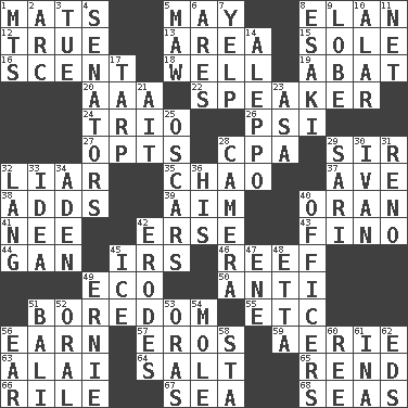 ACROSS 1. Floor protectors 5. Can I? 8. Style 12. Loyal 13. Type of rug 15. Flatfish 16. Odor 18. Not ill 19. Blind as ____ 20. Auto club (abbr.) 22. Orator 24. Musical group of three 26. Air pressure measure (abbr.) 27. Chooses 28. Accounting whiz (abbr.) 29. Title for a knight 32. One who doesn't tell the truth 35. US Secretary of Labor Elaine L. _ 37. "___ Maria" 38. Sums up 39. Direct toward a target or goal 40. NW Algerian seaport 41. Born 42. Celtic language 43. A pale, very dry sherry 44. Separate the seeds from cotton 45. Big collection agency 46. Coral collection 49. Environmental prefix 50. Opposed to 51. Mood resulting from idleness 55. And so on (abbr.) 56. Merit 57. Greek god of love 59. Nest on high 63. Jai _ 64. Table seasoning 65. Tear apart 66. Cause heat under the collar 67. Ocean 68. Oceans DOWN 1. Mountains (abbr.) 2. Curve 3. Third day of the wk. 4. Elected representatives 5. Informal term for the mouth 6. Ancient Greek god of war 7. Sharp bark 8. 1973 Nobel Price Winner (Physics) Leo 9. Ear part 10. Having or resembling wings 11. Remaining after all deductions 14. City in Syria 17. Canvas cover 21. Small island 23. White ___ sheet 25. Motion picture awards 28. Device for capturing images 29. Indian skirt 30. _ the terrible 31. Western Nevada city 32. Austrian-born American filmmaker Fritz 33. The content of cognition 34. Arabian gulf 36. Part of HMS, perhaps 40. Persons of authority 42. Eats (away) 45. Frozen water 47. Compass dir. 48. Singer James 49. Bert's buddy 51. Indonesian resort city 52. Relating to the mouth 53. Mouths or openings 54. Undercover agent 56. Ewer handle 58. R.R. building 60. Portuguese money of account (variant) 61. _ tizzy (2 wds.) 62. Begley and Asner