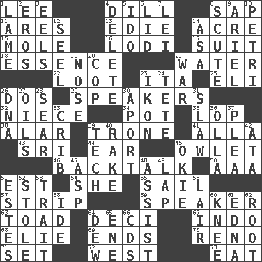 ACROSS 1. Area sheltered from the wind 4. Deli pickle 8. Plant excrement 11. Ancient Greek god of war 13. Singer Brickell 14. Measure of real estate 15. Undercover agent 16. Farming town in central California 17. Costume for a special activity 18. Center 21. Wetness 22. Plunder 23. Call ___ day 25. Biblical high priest 26. Two (Sp.) 29. Orators 32. Sibling's daughter 34. Plant holder 35. Chop off 38. Having or resembling wings 39. Heavy duty weighing machine 41. Silent film actress Nazimova 43. Indian title of respect (Mr.) 44. Hearing organ 45. A small or young owl 46. Sass 50. Auto club (abbr.) 51. Eastern Standard Time (abbr.) 54. A female animal or person 55. Move on water 57. Remove all contents or possession from 59. Orator 63. Frog relative 64. Tenth: prefix 67. _ china 68. Writer Wiesel 69. Extremities 70. Former U.S. Attorney General Janet 71. Arrange properly for use 72. 270 degrees 73. Erode DOWN 1. Unable to walk 2. Greek god of love 3. Snakelike fish 4. Keyboard key 5. Wedding promise 6. Flaplike covering 7. Luau accessory 8. Turtle shell scale 9. Satellite of Uranus 10. _ dish (used to culture cells) 12. Stitch closed the eyes of (a falcon) 14. White ___ sheet 19. Characteristic smell of wine 20. Police officer (slang) 21. Armed conflict 23. Image 24. Wig 26. Heredity factor (abbr.) 27. Lubricates 28. Shrivel 30. To the left, to Queeg 31. Cole _ (cabbage dish) 33. Baby bed with high sides 36. Water jar 37. Entreaty 39. Technology 40. Libertine 42. _ moment's notice (2 wds.) 45. Migrant worker of the '30s 47. Viper 48. Help 49. Infant locale 51. _____ Park, CO 52. Fur scarf 53. Distinguishing feature 56. Den 58. Binary compound 60. Leg joint 61. Pulitzer Prize-winning author Ferber 62. Carrot, for example 64. Morning condensation 65. Compass dir. 66. Music discs