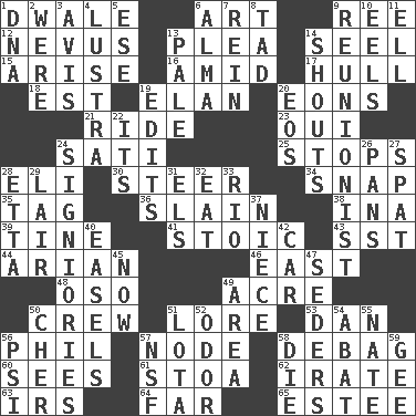 ACROSS 1. A sleeping potion; an opiate (poet.) 6. Nonscientific branch of learning 9. To riddle 12. Mole, birthmark 13. Entreaty 14. Stitch closed the eyes of (a falcon) 15. Originate 16. Among 17. Frame or body of a ship 18. Eastern Standard Time (abbr.) 19. Enthusiasm 20. Immeasurably long periods of time 21. Travel on or in a vehicle 23. Fr. "Yes" 24. Suttee (variant) 25. Constricts 28. Biblical high priest 30. Navigate 34. Fastener 35. Label 36. Killed 38. _ tizzy (2 wds.) 39. Prong on a fork 41. Unemotional 43. Fast jet (abbr.) 44. Believer in; advocate of (suffix) 46. 90 degrees 48. Bear (Spanish) 49. 43,560 square feet 50. Ship's personnel 51. Old wives' tales, e.g. 53. One of the 12 tribes of Israel 56. Silvers or Donahue 57. Thickened enlargement 58. Debunk (Brit. slang) 60. Perceives with the eye 61. Portico 62. Feeling or showing extreme anger 63. Big collection agency 64. Distant 65. First name in cosmetics DOWN 1. Heredity factor (abbr.) 2. Past tense of be (plural) 3. Deliberation 4. A period of five years 5. Compass dir. 6. _ mater 7. It's straight from the horse's mouth 8. Bit 9. One who advocates reunion 10. Snakelike fish 11. Pipe bend 13. Diluted with white 14. Yells 19. Proofreads 20. Greek goddess of the dawn 22. It is 24. Seigniories (variant) 26. Baking dishes 27. Petty quarrel 28. Singer James 29. Den 31. Raised railways 32. Erode 33. River (Sp.) 37. Sibling's daughter 40. Artist's stands 42. Automobile 45. At this time 47. Spring feasts 49. Type of rug 50. "Mermaids" star 51. Globular water bottle used in Asia 52. Aroma 54. Blind as ____ 55. Nathan's nickname 56. Air pressure measure (abbr.) 57. Science/research agcy. 58. Pass on 59. Turn to the right