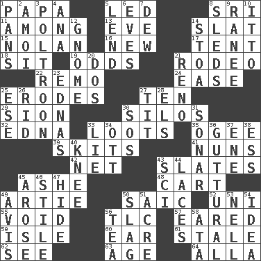 ACROSS 1. Dad 5. Directed 8. _ Lanka 11. Amid 13. First lady 14. Narrow board 15. Pitcher Ryan 16. ___ Haven, CT 17. Portable shelter 18. Be seated 19. Likelihood 21. Cowboy competition 22. San ____ (Riviera town) 24. Relaxation 25. Eats (away) 27. "___ Little Indians" 29. The Jewish people; Israel 30. Grain storage towers 32. Pulitzer Prize-winning author Ferber 33. Plunders 35. Double curve, resembling the letter S 39. Burlesque acts 41. Religious women 42. Fish or hair follower 43. Chalkboards 45. American tennis player Robert 48. Haul 49. Nick name for Arthur 50. Ketch in the Levant 52. University (slang) 55. Lacking any legal or binding force 56. Affectionate concern, for short 57. Having ears or earlike features 59. Small island 60. Ewer handle 61. Showing deterioration from age 62. Perceive with the eye 63. Ripen 64. Silent film actress Nazimova DOWN 1. Zero-star reviews 2. Mine, in Marseilles 3. Coward 4. Santa ___, CA 5. Grant temporary use of 6. Nights before holidays 7. Morning condensation 8. Bobsleighs 9. The wife of a rajah (variant) 10. "Tell ____ the Marines!" 12. Dwarf 14. Portico 20. Two (Sp.) 21. Former U.S. Attorney General Janet 23. Ferber et al. 25. Compass dir. 26. To free from 27. Teat (slang) 28. Raised railways 30. Mayday 31. Echolocation 33. Falsehood 34. Baseball player Mel 36. From the throat 37. Compass dir. 38. Double-curved letter 40. Leg joint 43. _-fi 44. Shoestrings 45. Came up 46. Vertical member of a panel or frame 47. Flintstone garb 49. Opinion 50. Volcanic refuse 51. 43,560 square feet 53. 1994 drama film starring Jodie Foster 54. The main thing one is thinking about 56. Afternoon social gathering 58. _ moment's notice (2 wds.)